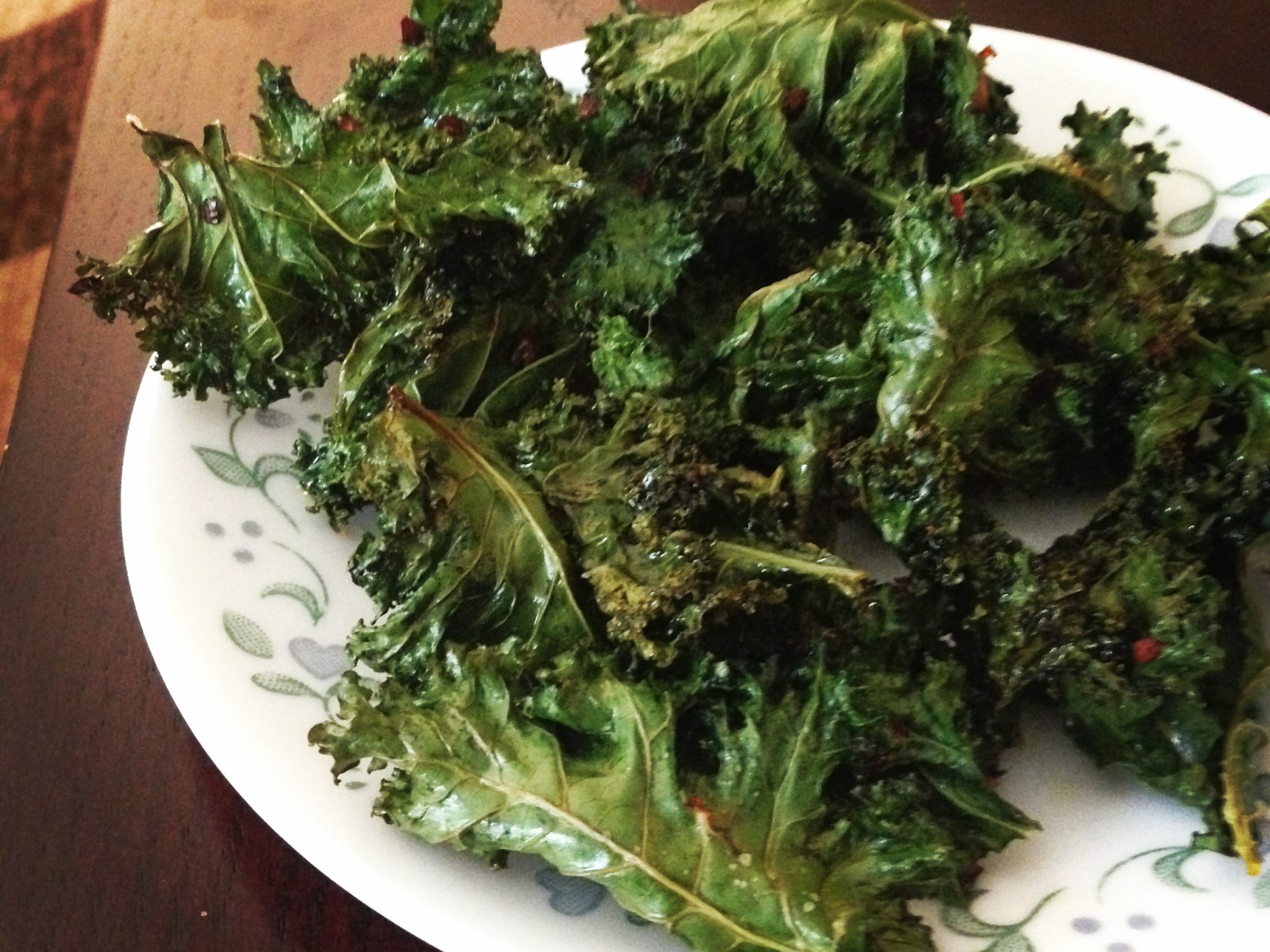 Take a baking sheet lined with either aluminum foil or parchment paper and spread the kale out in a single layer. Put the sheet into your preheated oven for about 10 minutes, or until crisp. If you let them cool off a bit, they will crisp up more, but if you don’t want to wait… I don’t judge.