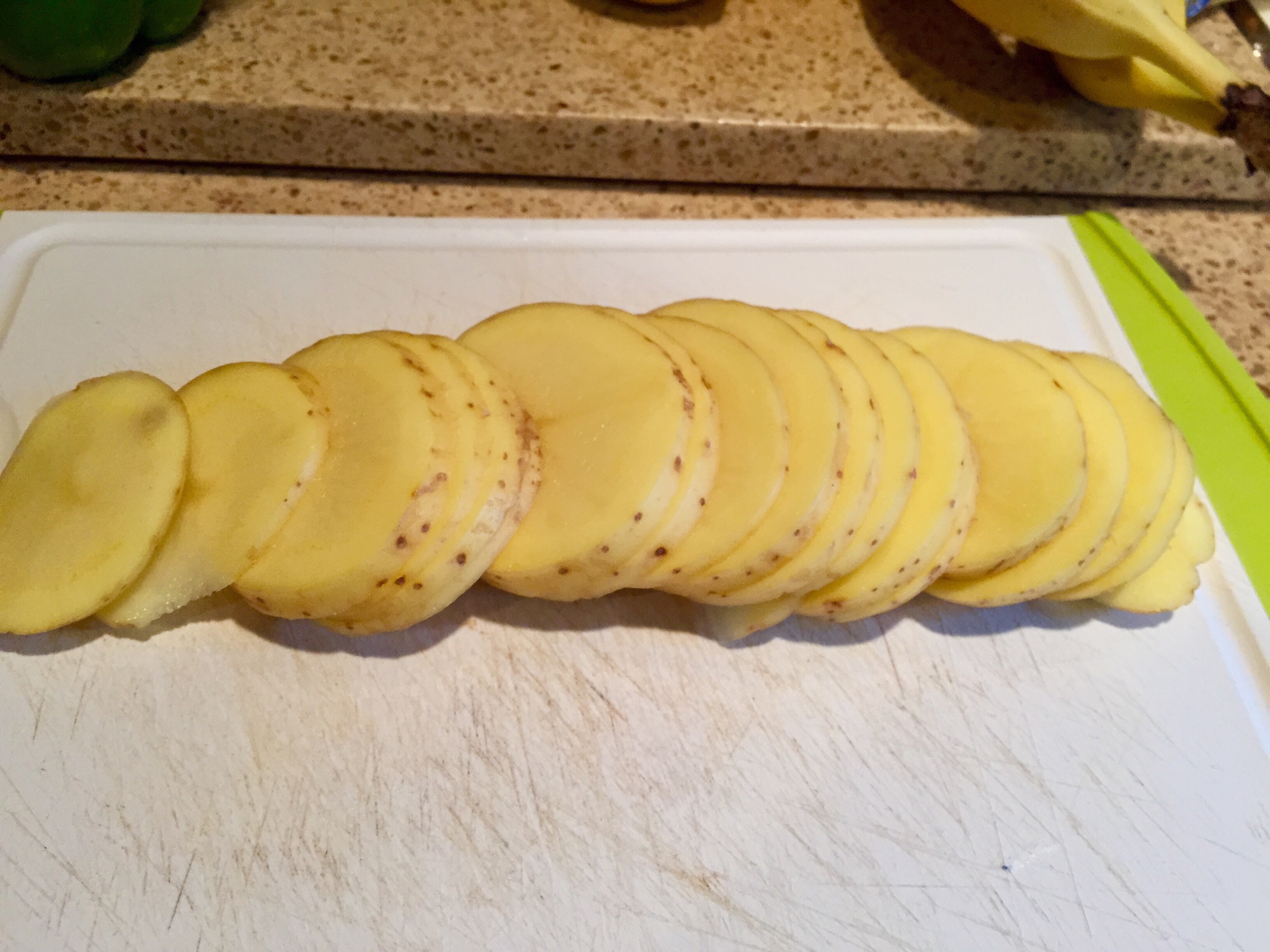First, take your potato (preferably Yukon gold, they stay nice and creamy) and slice them into thin rounds. Since I’m just cooking for myself this morning, I only used one potato, which is more than enough for me.