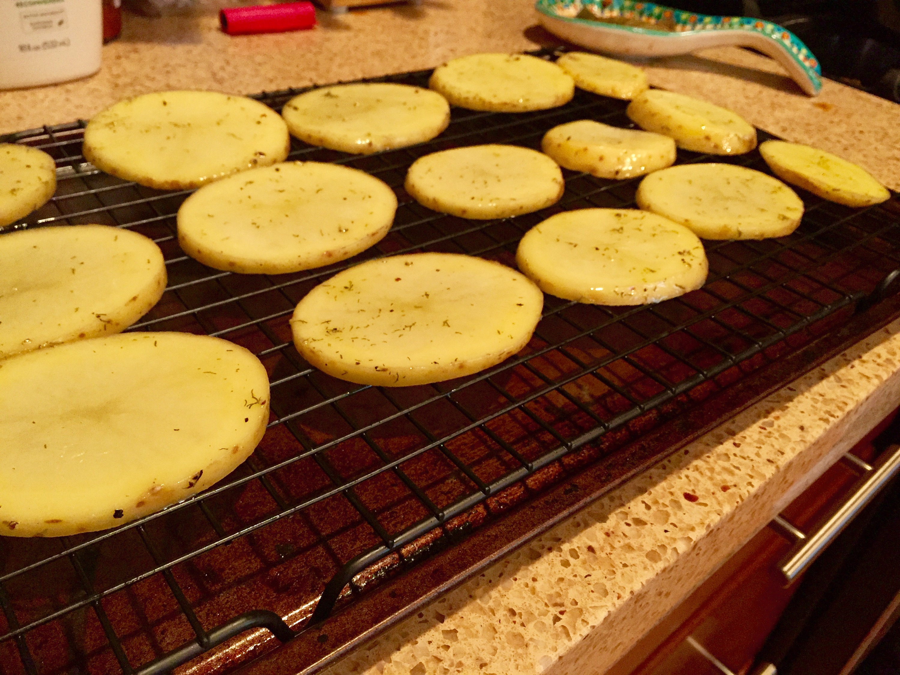 Take a flat baking sheet and set a wire cooling rack on top of it. The cooling rack is crucial, it will allow your potatoes to cook evenly and quicker, and will drain off any excess oil. This also lets the bottoms of the potato slices to crisp up nicely. Place your sliced potatoes on the cooling rack, like so: