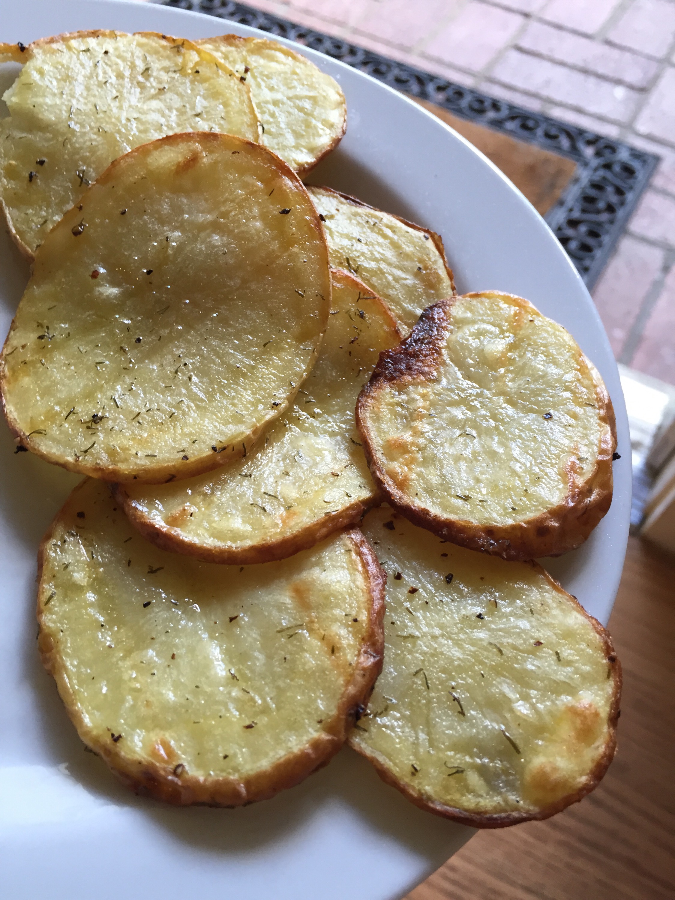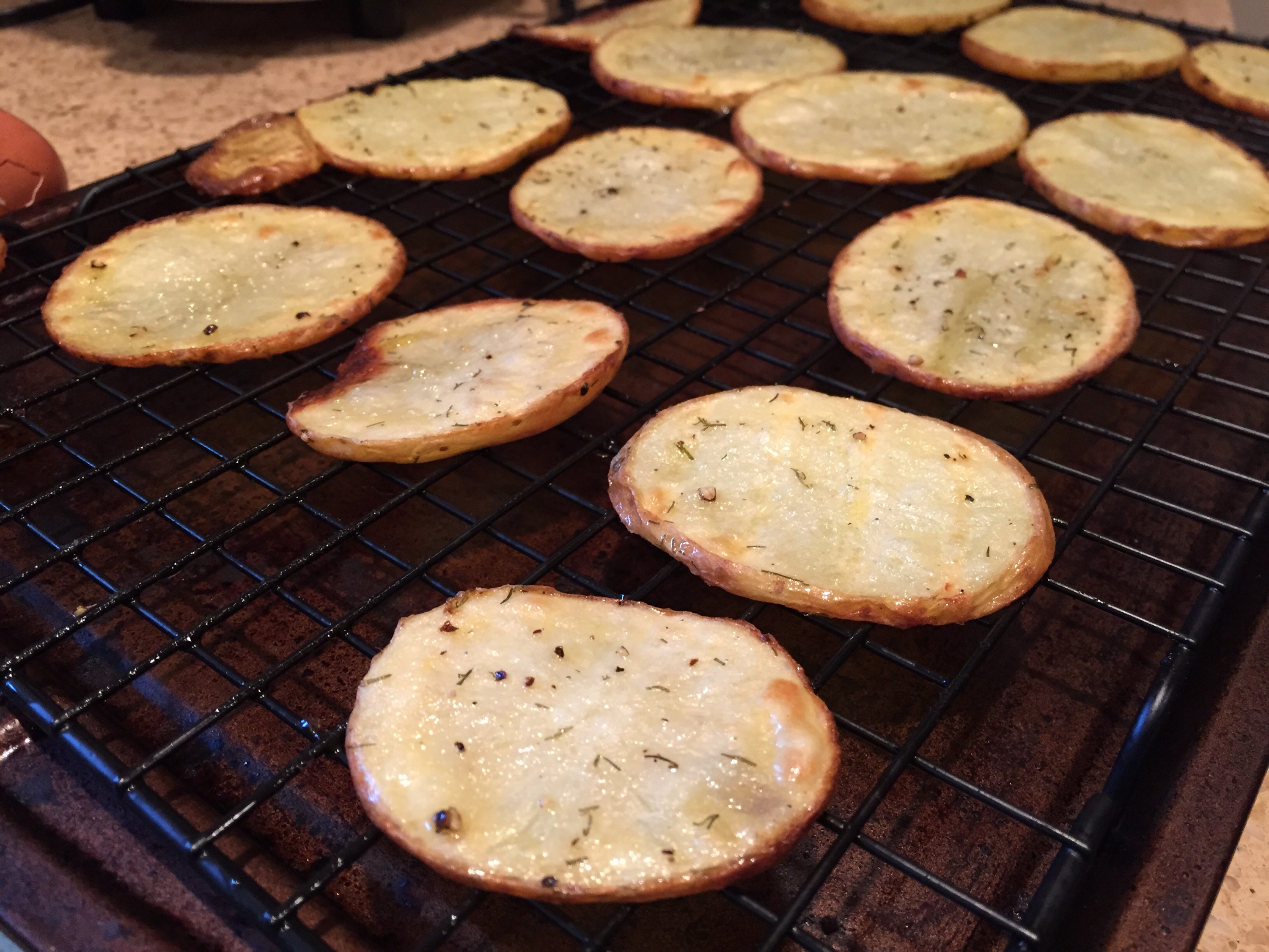 On to the potatoes. I love potatoes, but I hate how long they can take to cook. When you’re in a time crunch, or you’re just too hungry to wait for large chunks of potatoes to cook in your oven, slice those bad boys and have them ready in about 20 minutes.