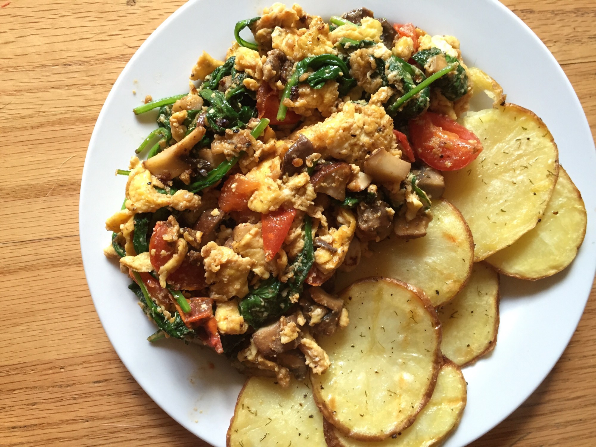 The scramble is pretty self explanatory; it’s a tomato, mushroom, and spinach scramble. Cook your veggies in the pan first, and then add the scrambled eggs to the pan. Remember to keep moving the eggs around! It breaks down the proteins and makes your eggs fluffy and soft.
