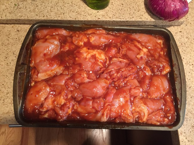 Once your sauce is done, keep some aside in a jar to be used as a garnish. Take the remaining sauce and marinate chicken or pork overnight–I used the sauce to marinate some chicken thighs.