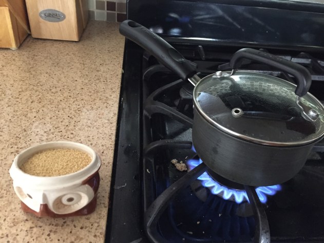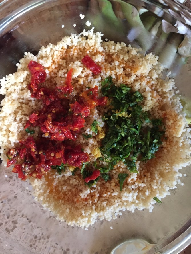 Get your couscous going first, it can hang out in the meantime while you get everything else ready. Put 1 cup + 2 tablespoons of water in a small pot, and bring to a boil. Once it’s come to a boil, pour in the uncooked couscous, give it a good stir, cover, and take it off the heat. The couscous will cook in 5 minutes. What?! I know. I love couscous for this reason. Anyway, we’re going to toss it with some other stuff later, so let it hang out.