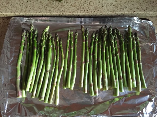 Get a flat baking sheet, line with aluminum foil, and spread the asparagus out on an even layer. Drizzle with olive oil, and season lightly with salt and pepper. Give it all a nice roll so everything is coated in the oil and seasoning.