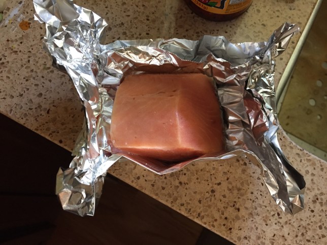 Pour the sauce over the salmon in your aluminum boat, and pinch the edges together so everything is enclosed.