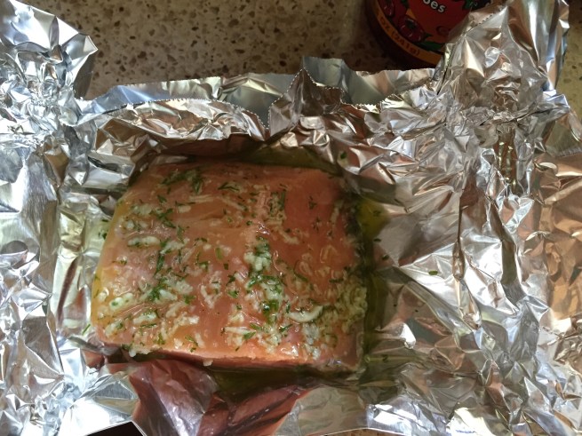 Finally, your salmon. Make a little tent foil for your salmon, making sure the edges come up so the oil mixture you drizzle on later doesn’t come out of the side: