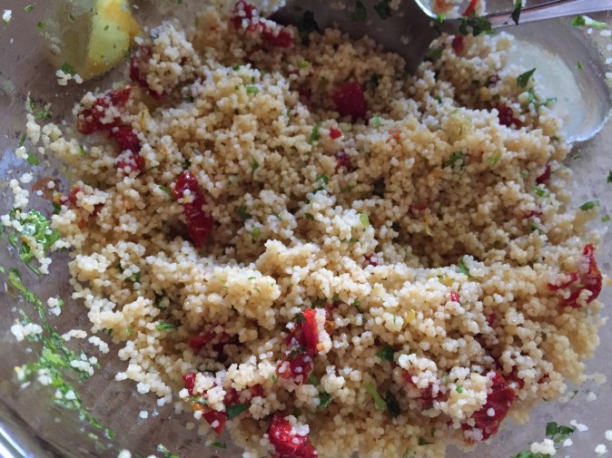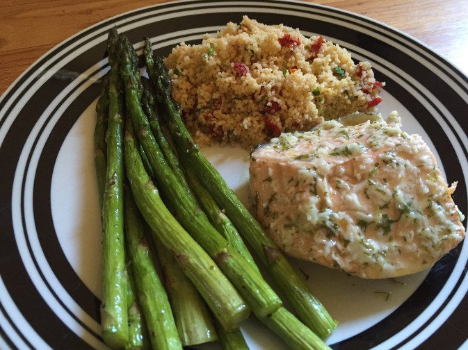 Place the salmon and asparagus into your preheated oven, for 20 minutes. While that’s cooking, fluff your cooked couscous with a fork and place it in a bowl. Toss the couscous with the lemon zest, chopped cilantro, sun dried tomatoes, and a drizzle of the oil from the sun dried tomatoes. Sprinkle lightly with salt.