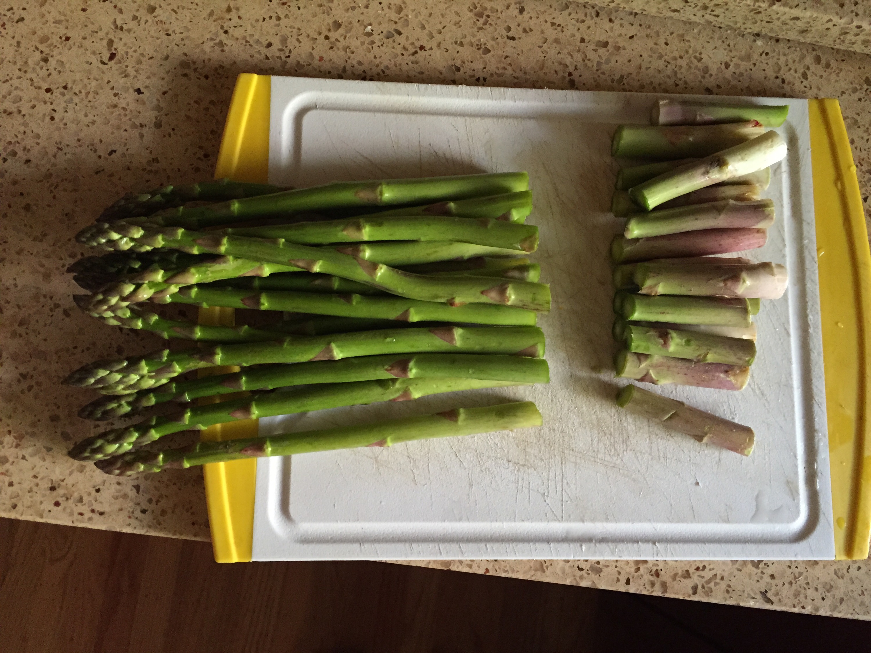 Next, trim your asparagus. The ends are tough even when it’s cooked, so trim off about one inch, like so: