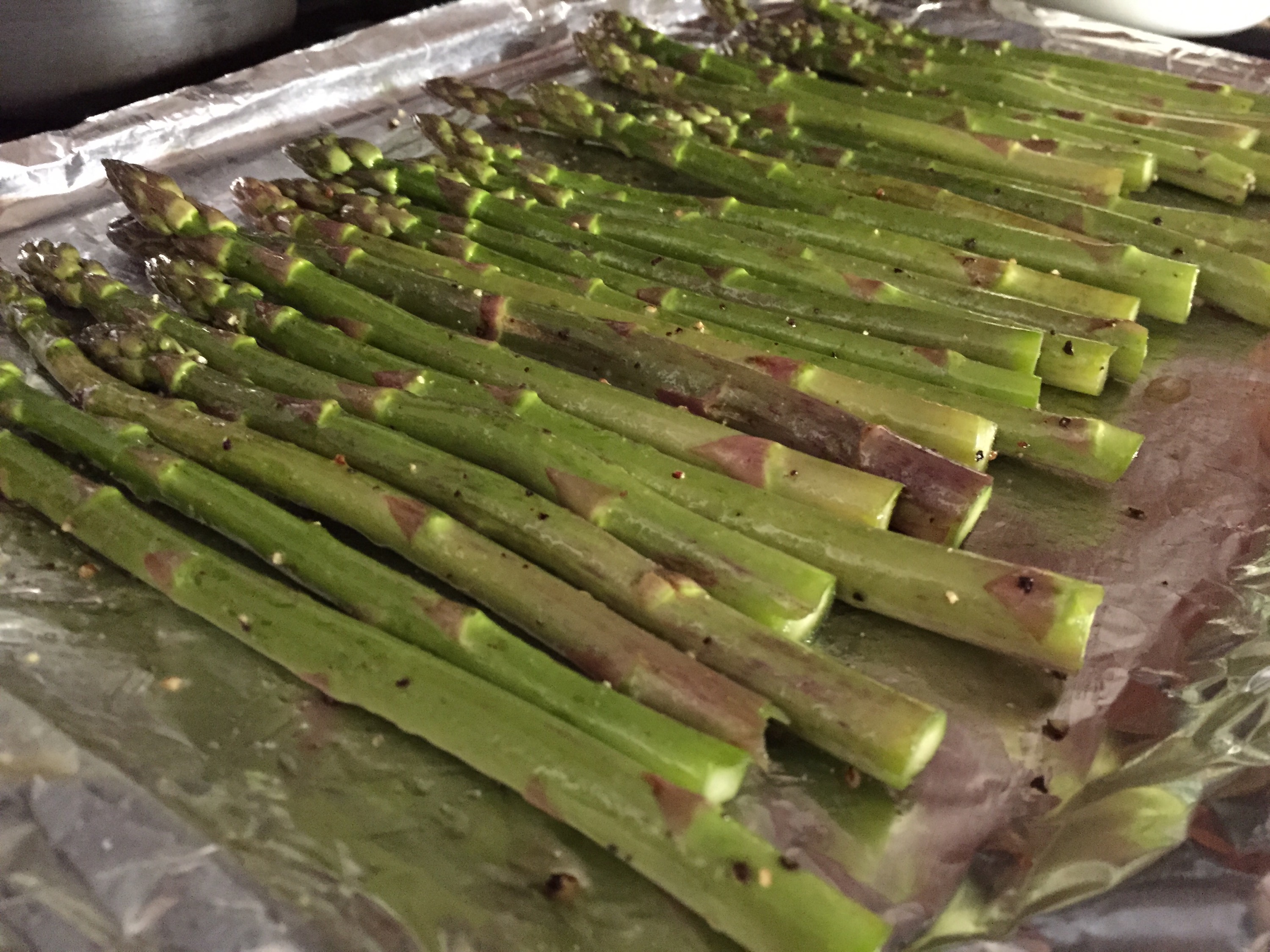 Get a flat baking sheet, line with aluminum foil, and spread the asparagus out on an even layer. Drizzle with olive oil, and season lightly with salt and pepper. Give it all a nice roll so everything is coated in the oil and seasoning.