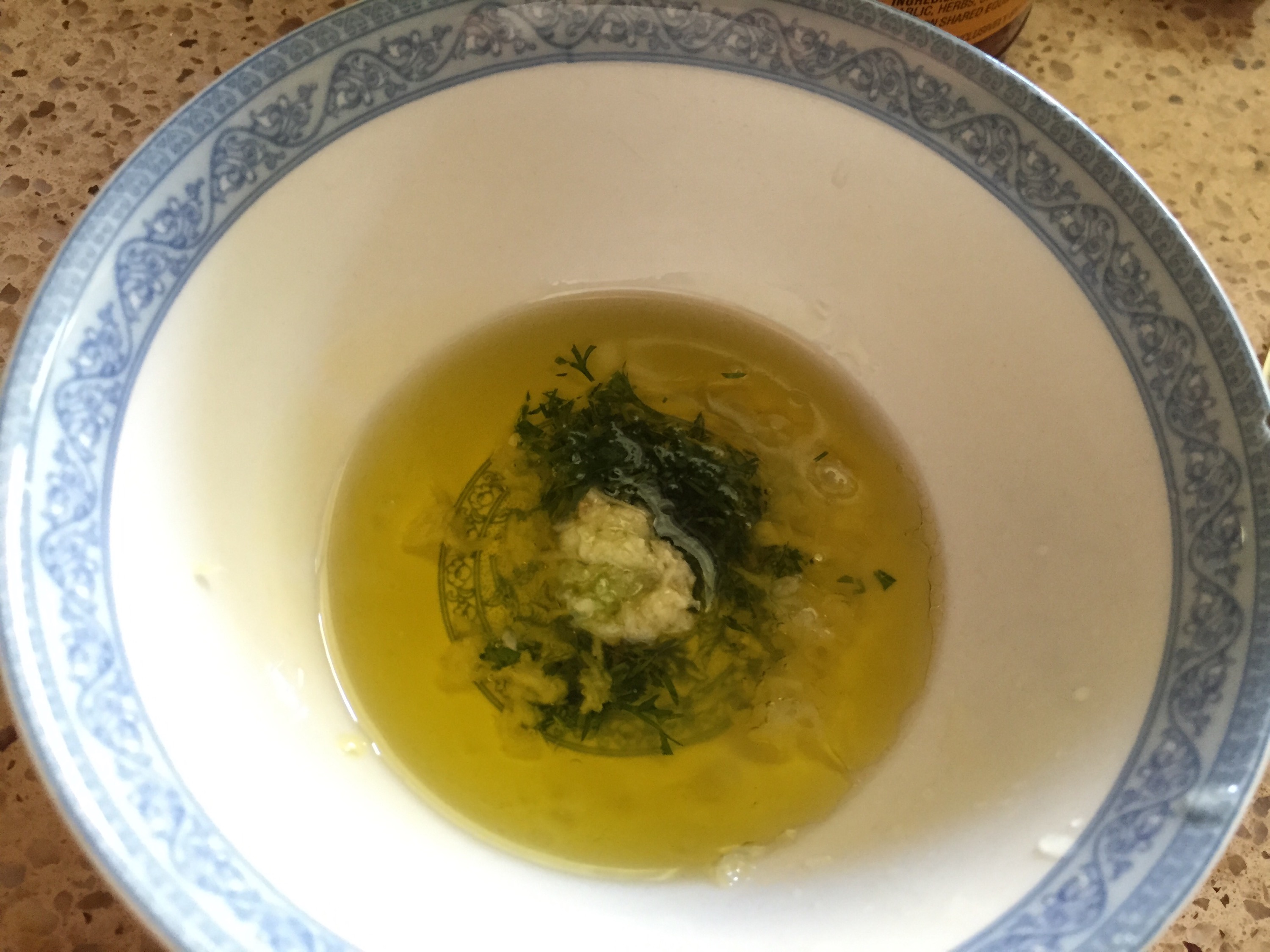 In a small bowl, whisk together the olive oil, fresh dill, grated garlic, and lemon juice.