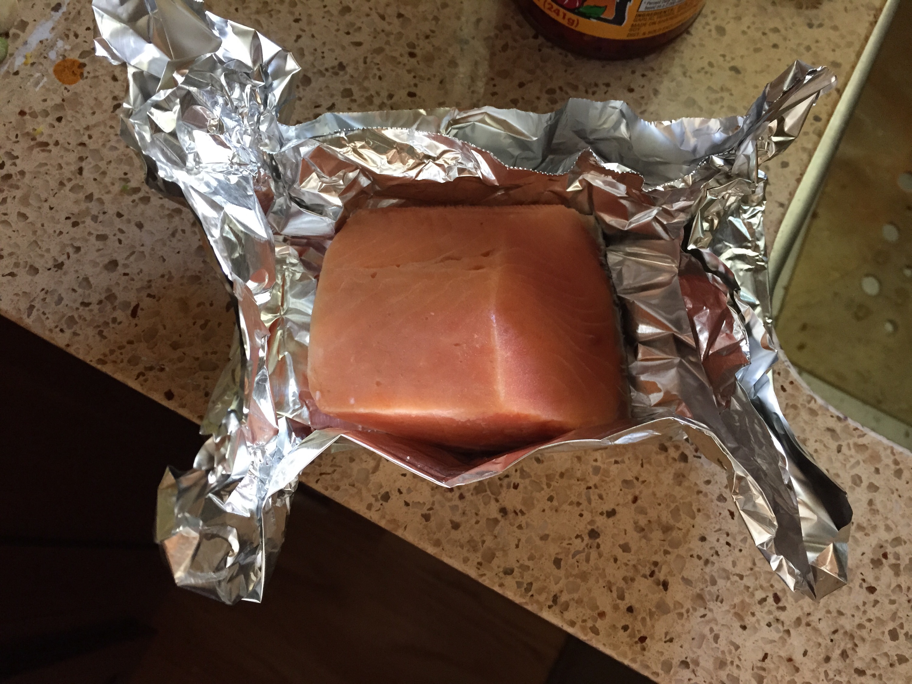 Finally, your salmon. Make a little tent foil for your salmon, making sure the edges come up so the oil mixture you drizzle on later doesn’t come out of the side: