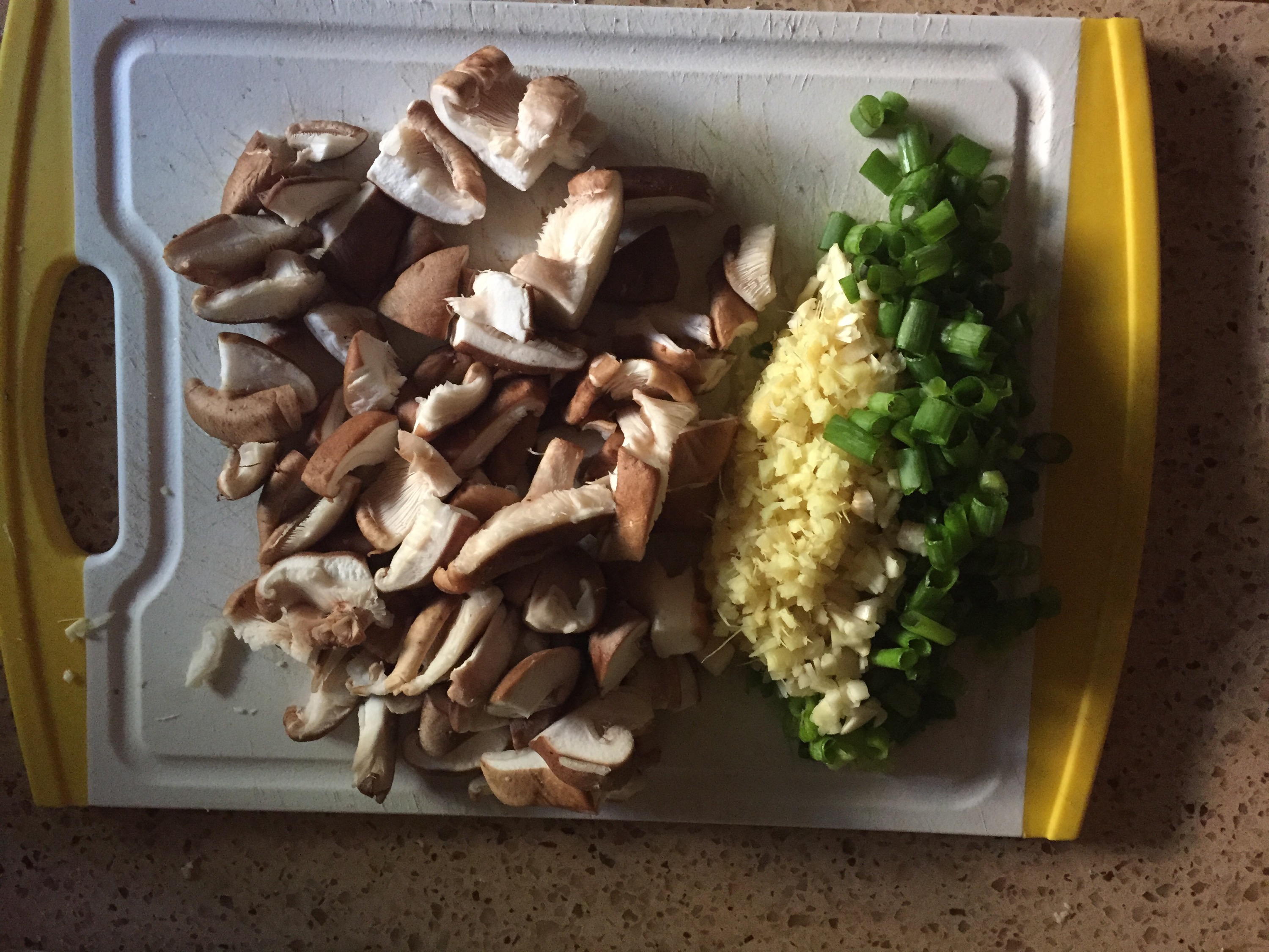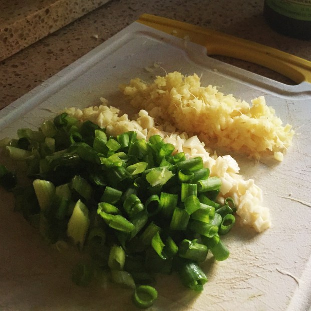 Get your ingredients chopped first. Ginger, garlic, and green onion is like the holy trinity of Asian cooking.
