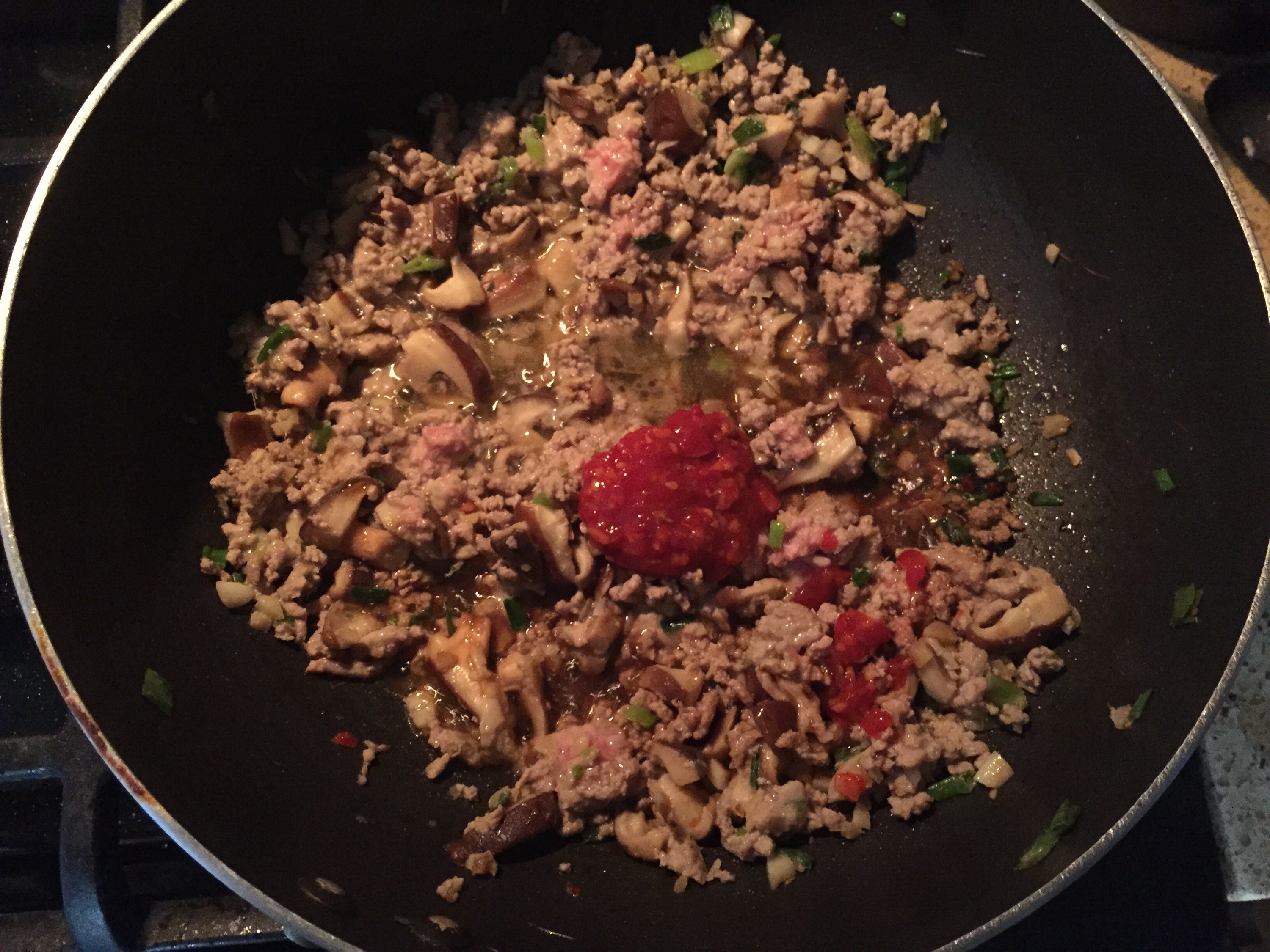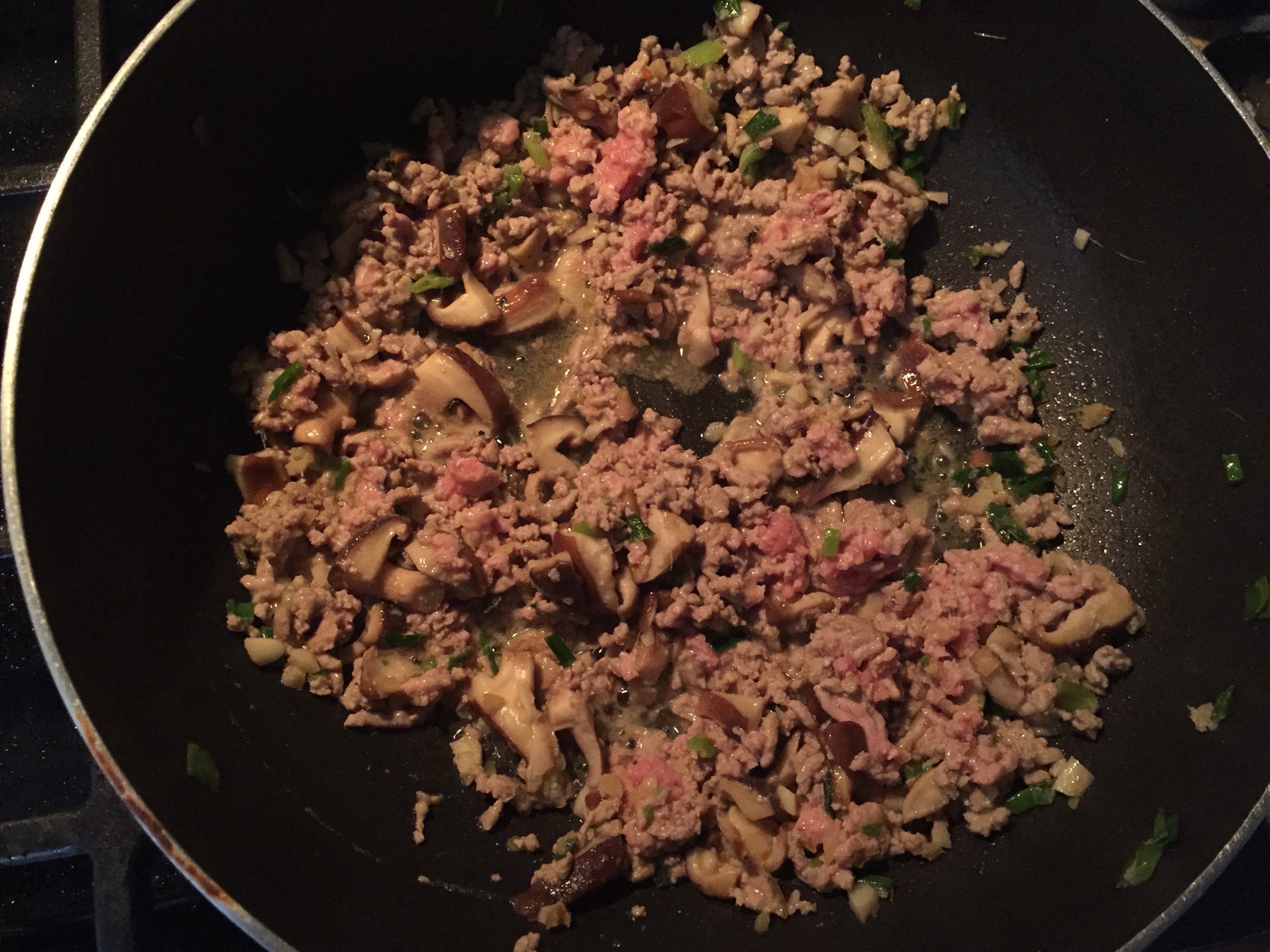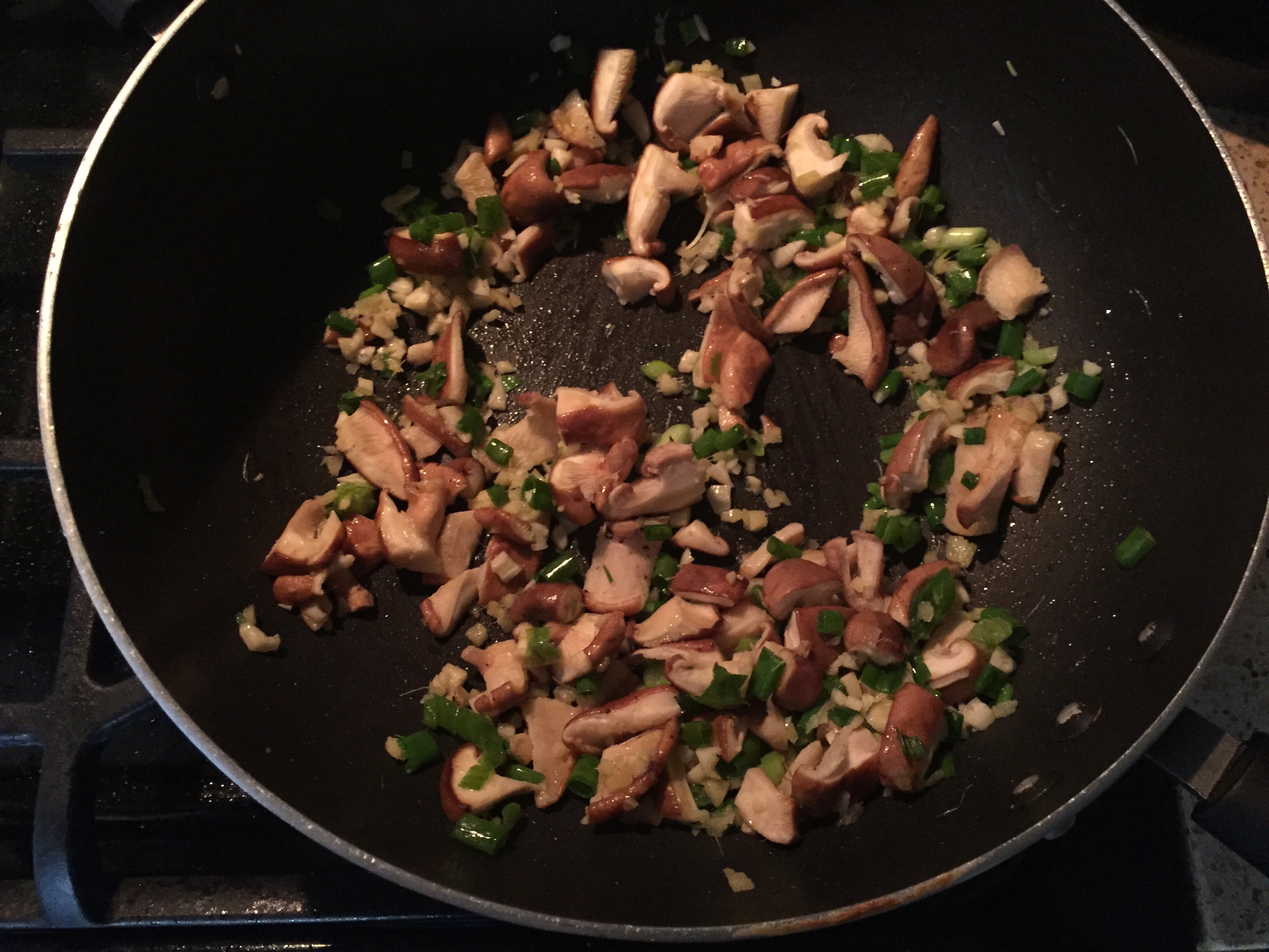 In a large pan, heat the sesame oil. Keep your heat on medium, and add the Asian holy trinity, along with the chopped shiitake mushrooms.