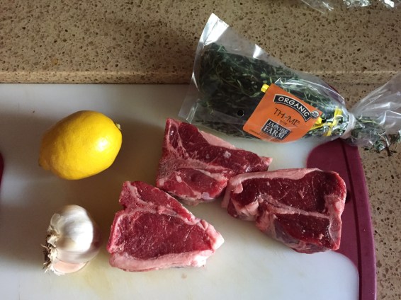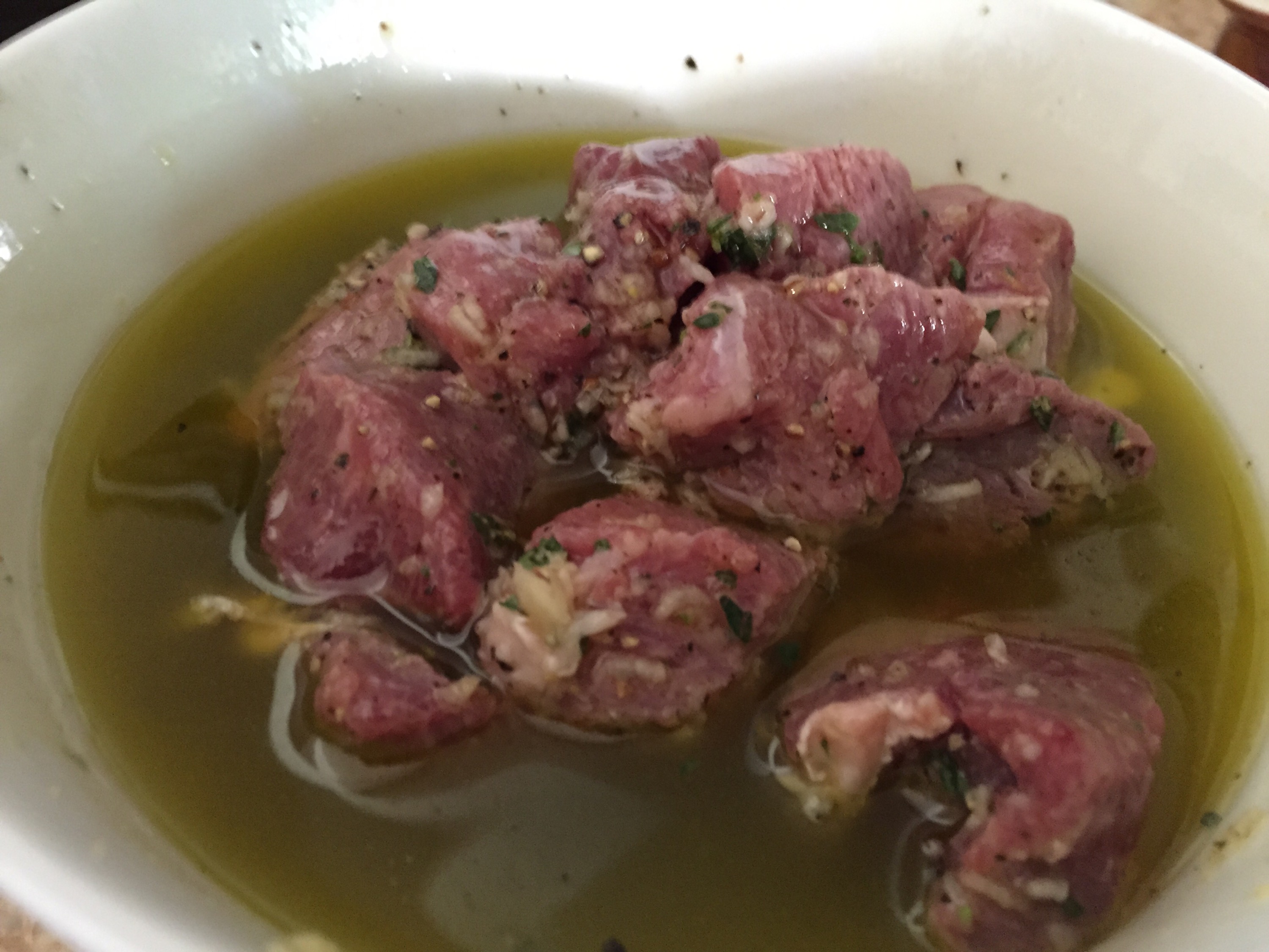 In a bowl, whisk together your olive oil, fresh thyme, lemon juice, garlic, salt, and pepper. Place the lamb into a small bowl or a ziplock bag, and pour the marinade over the meat. Make sure it’s mixed well and all the meat is covered in the marinade, and then let it hang out in your fridge overnight.