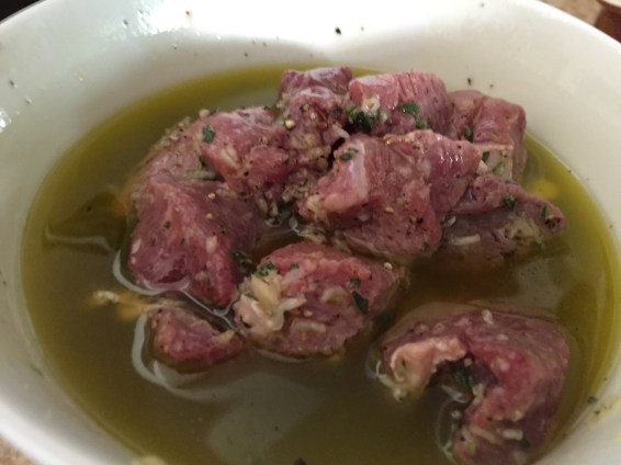 Next, you want to marinate your lamb the night before; that way it soaks up all those flavors. Cut the meat off of the bones, and trim any fat. With the remaining meat, cut them into 1 inch cubes.