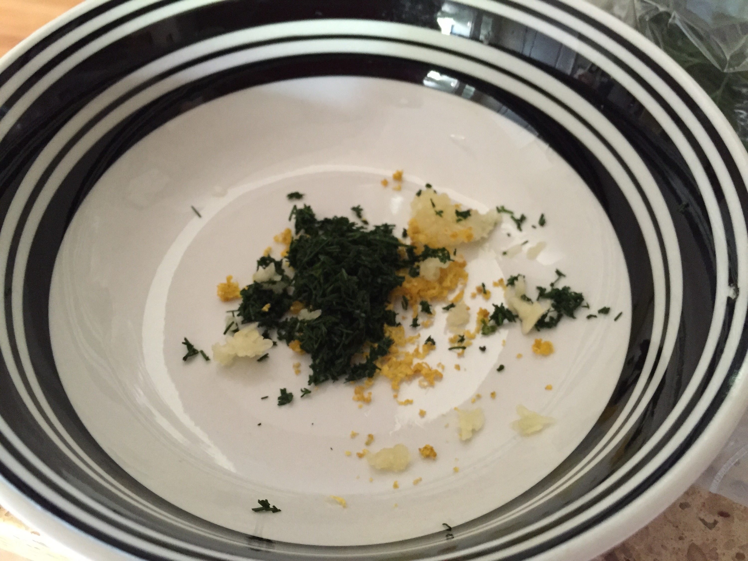First, make the sauce. Chop some fresh dill, and zest the lemon you use for the lamb marinade. Add that into a bowl, along with the yogurt, 1 clove of garlic (either grated or finely chopped. I prefer grated, as you all probably know), and a squeeze of lemon juice. Whisk it all together, add salt to taste, and let it sit overnight.