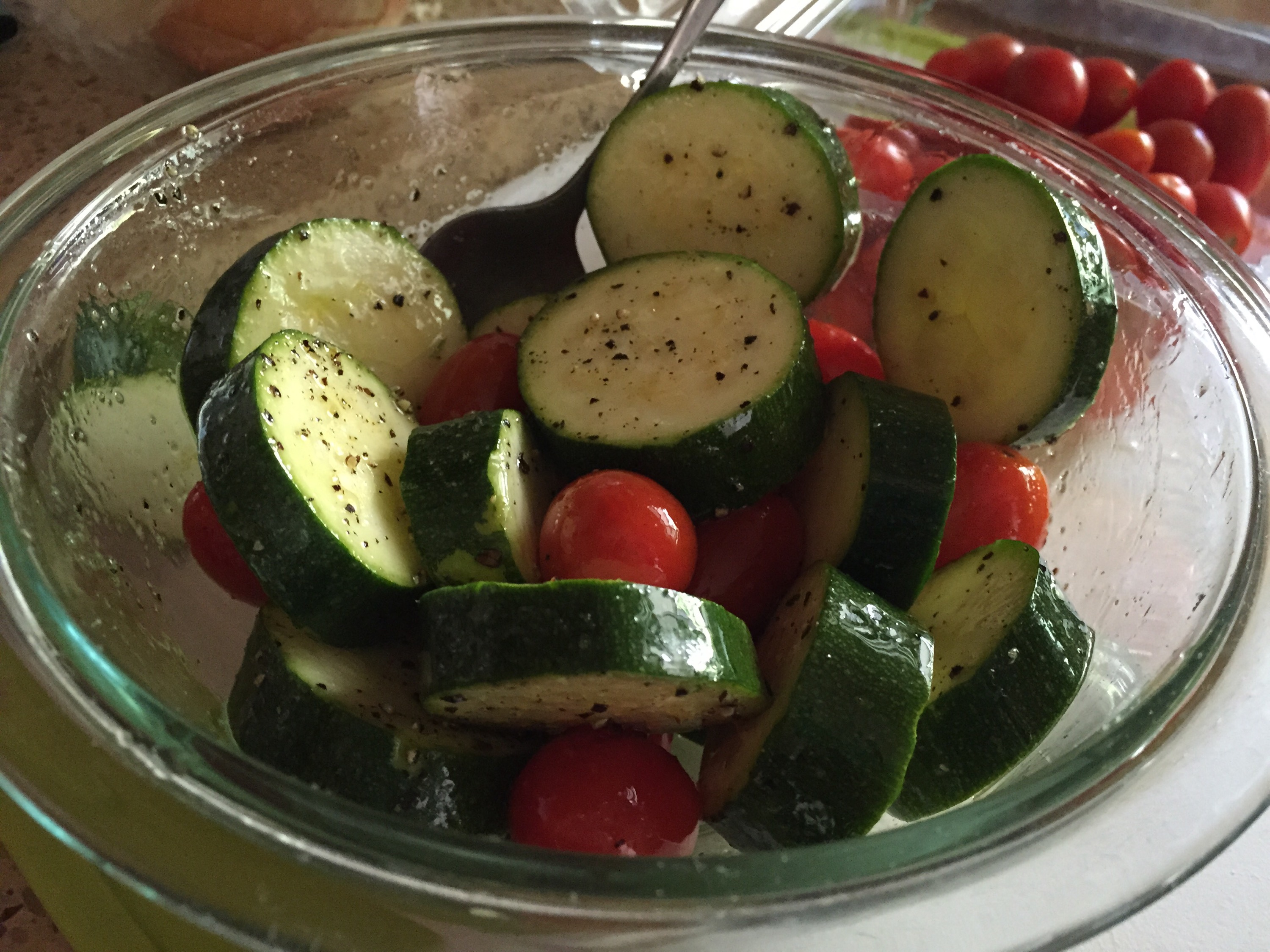 Make sure you’ve soaked your skewers in water for at least 20 minutes to prevent them from burning. Cut your zucchini into fairly thick slices–you don’t want them to be completely cooked way before your lamb is done. Give your zucchini and tomatoes a quick toss with olive oil, salt, and pepper.