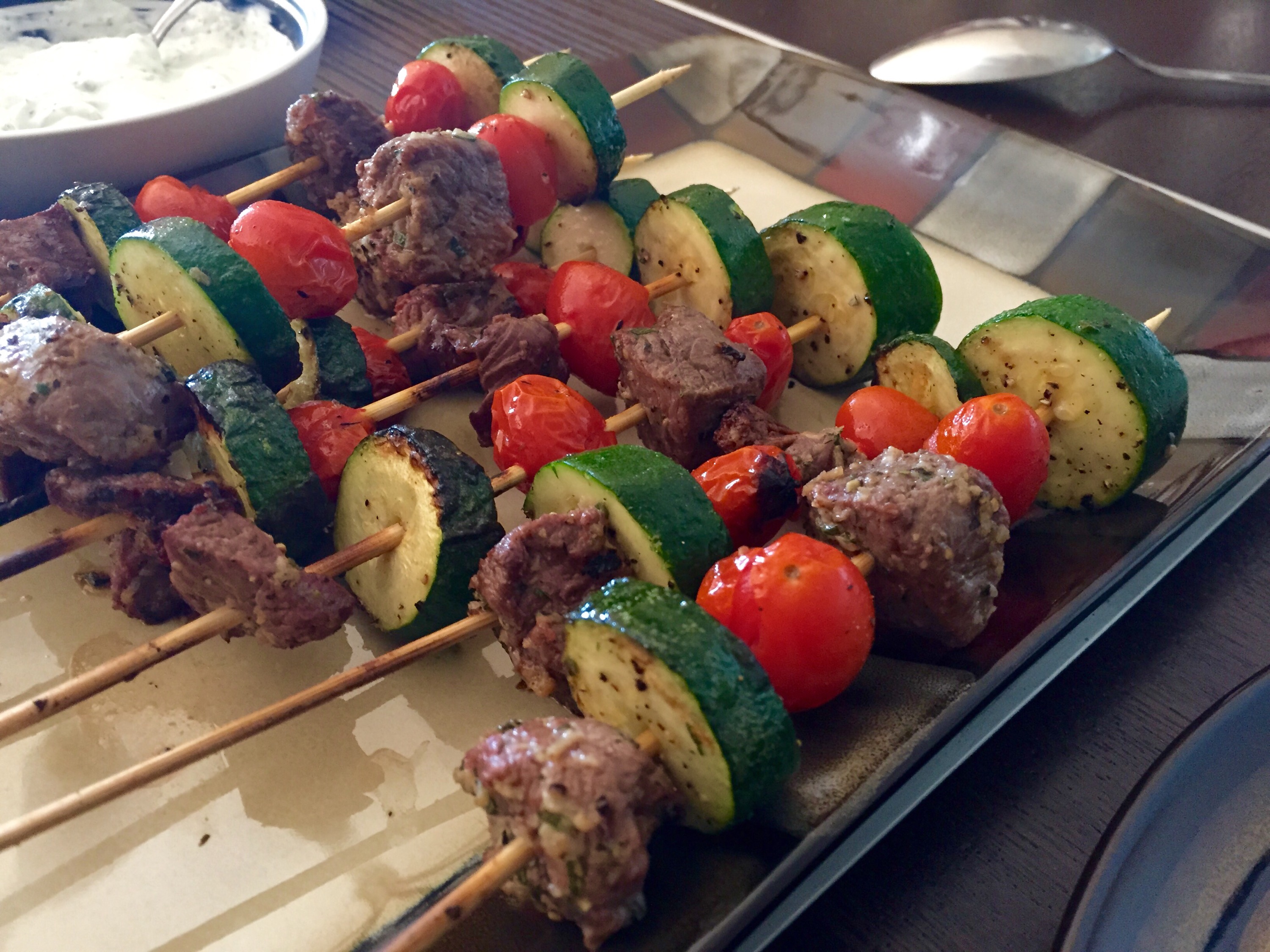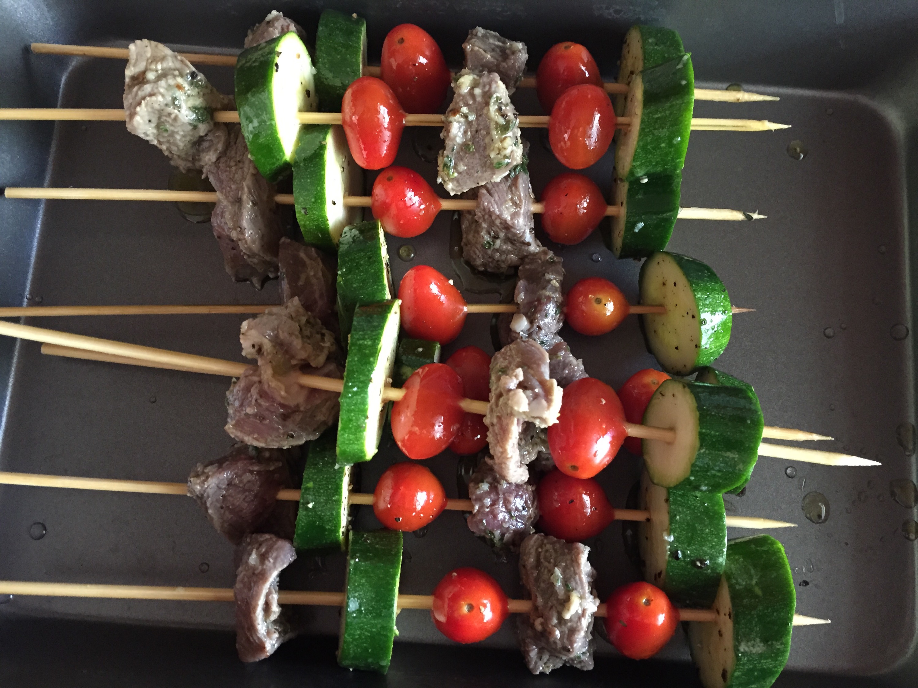 Assemble the kebabs by putting lamb, zucchini, tomato, lamb, tomato, and zucchini. Like so: