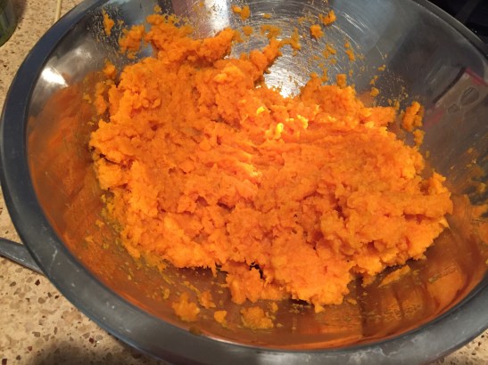 Cut your sweet potatoes in half (width wise), and steam them for about 45 minutes. When they’re done, peel the skin off and place them in a bowl.