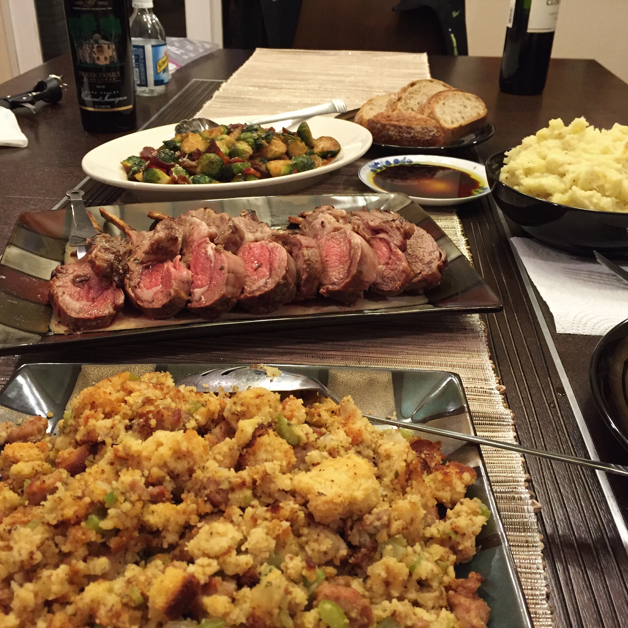 Along with the lamb, I made a cornbread and sausage stuffing, roasted garlic mashed potatoes, and bacon brussels sprouts.