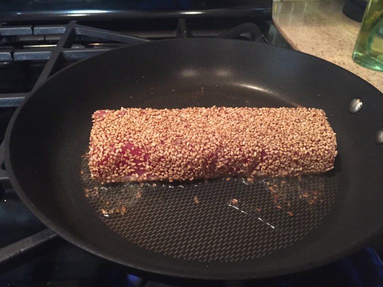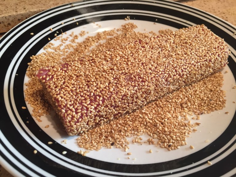 Pour sesame seeds on to a large plate. Cover all sides of the tuna in seeds and set aside.