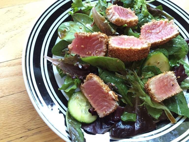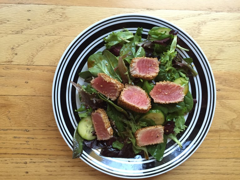 Transfer your salad to a plate and lay the sliced tuna on top. Enjoy!