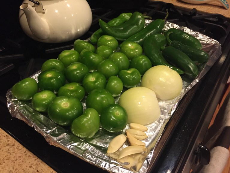 First, peel your tomatillos and wash the sticky residue off of them. Line a flat baking sheet with foil and lay out your tomatillos, jalapeños, anaheim chiles, onion, and garlic.