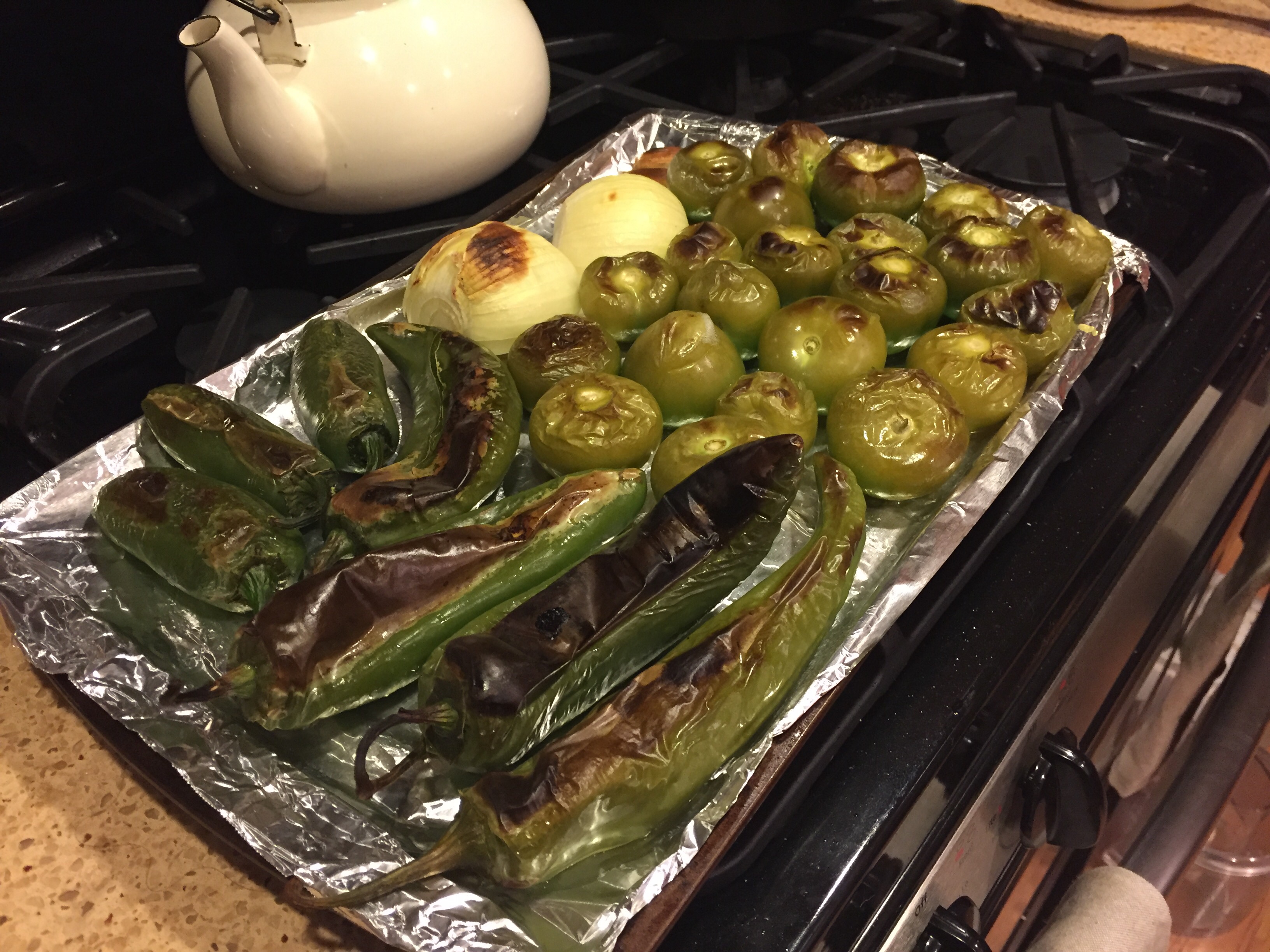 Drizzle a little vegetable oil over everything and place under your broiler until everything starts to char and the tomatillos release their juice. Use tongs to flip everything over to ensure the char is evenly distributed. If you don’t flip your chiles especially, half of the skin will be difficult to peel off.