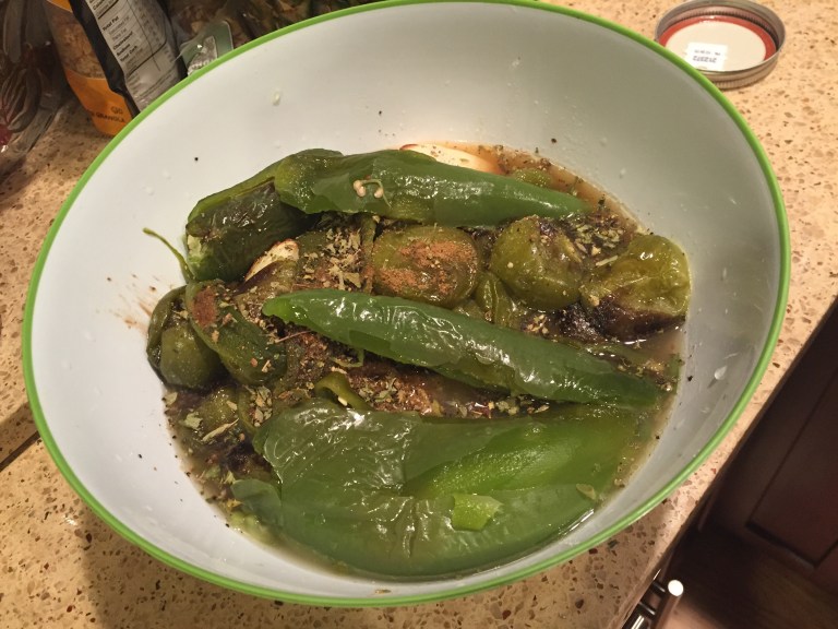 Some people peel their peppers by placing them in a ziploc bag to steam, but I prefer throwing them in an ice bath. This method also makes the peppers cool enough to handle. If you like spice, keep the seeds in the jalapeños. Otherwise, remove the stems of all the chiles and remove all the seeds.
