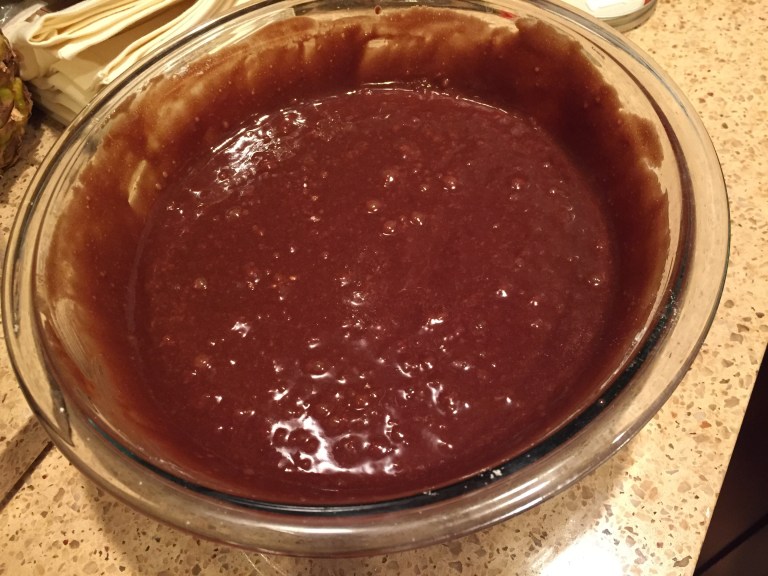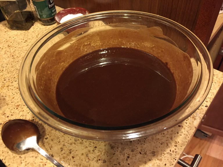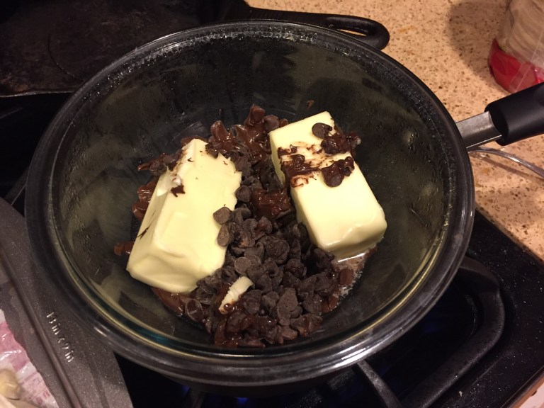 Get your chocolate going. Use a double boiler (or just put a glass bowl over a pot as I did) and melt your butter and chocolate chips together.