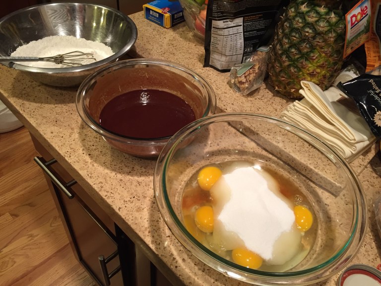 Pour the chocolate mixture into your egg mixture and whisk until it’s just combined, then slowly add in your dry mixture.