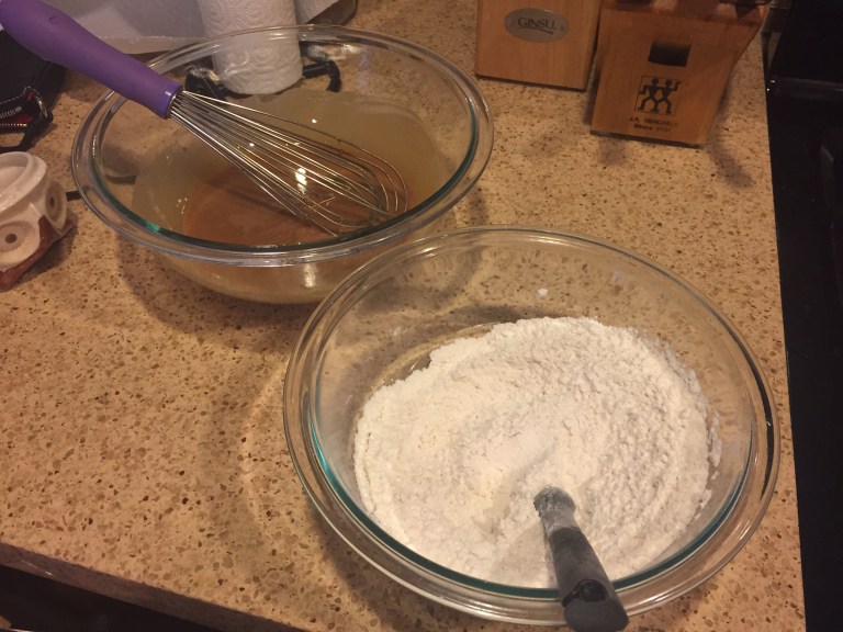 In a separate bowl, whisk together your flour, baking soda, and salt. Pour the dry mixture into your wet mixture and combine until it forms a dough.