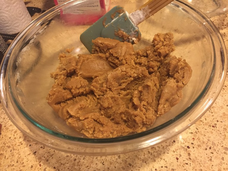 Mix your peanut butter and butter together until it’s a smooth mixture. Beat your sugars in, and once the mixture has come together beat in your egg and vanilla.