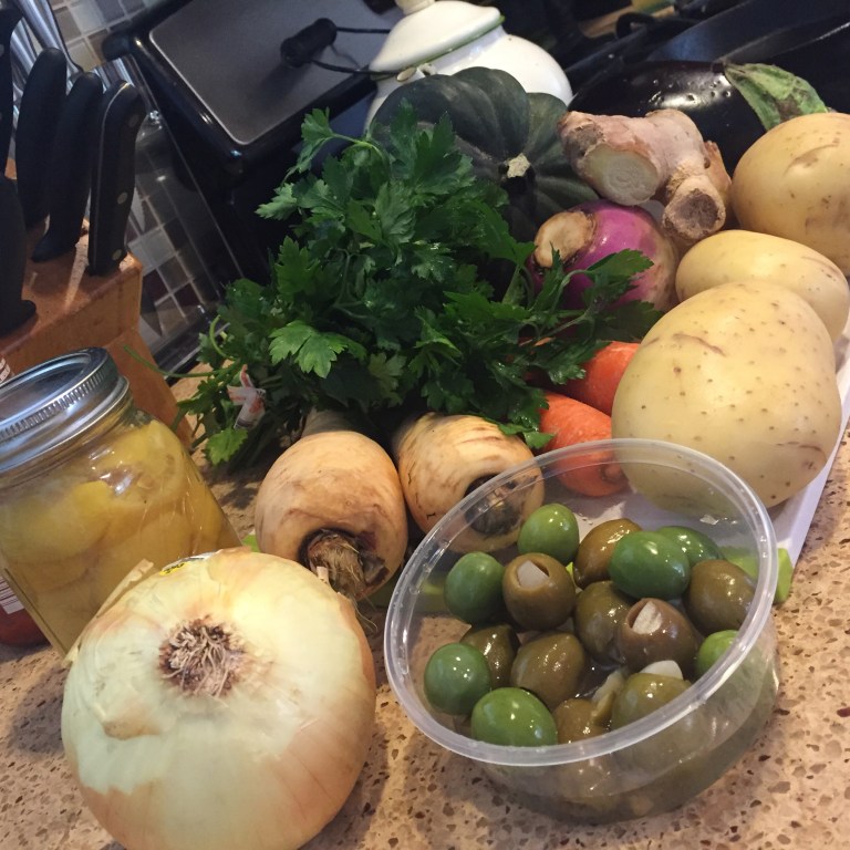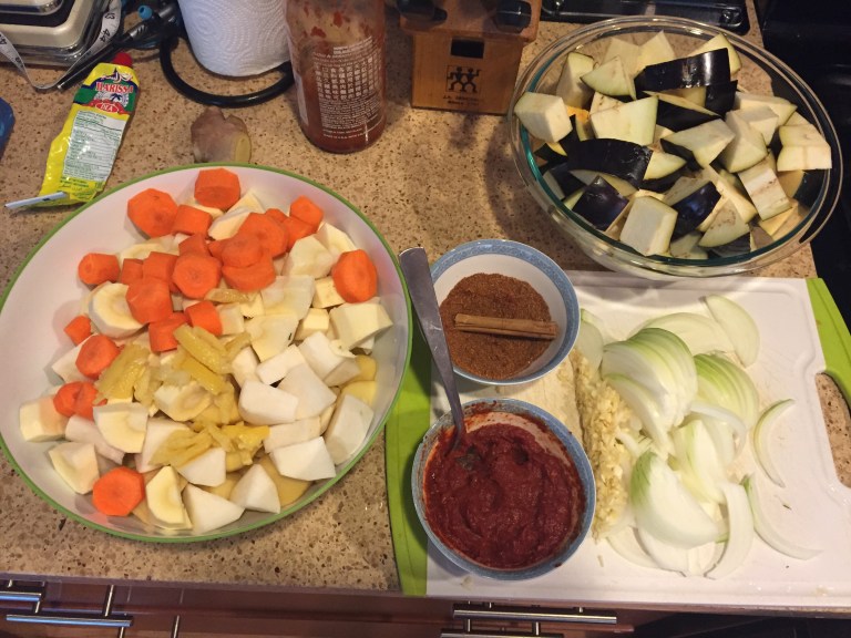 Peel the parsnips, carrots, and turnips, and cut them into 1 inch cubes. Cut your potatoes, squash, and eggplant into 1 inch cubes. If your bowl can fit everything, great! Add the chopped preserved lemon here too.