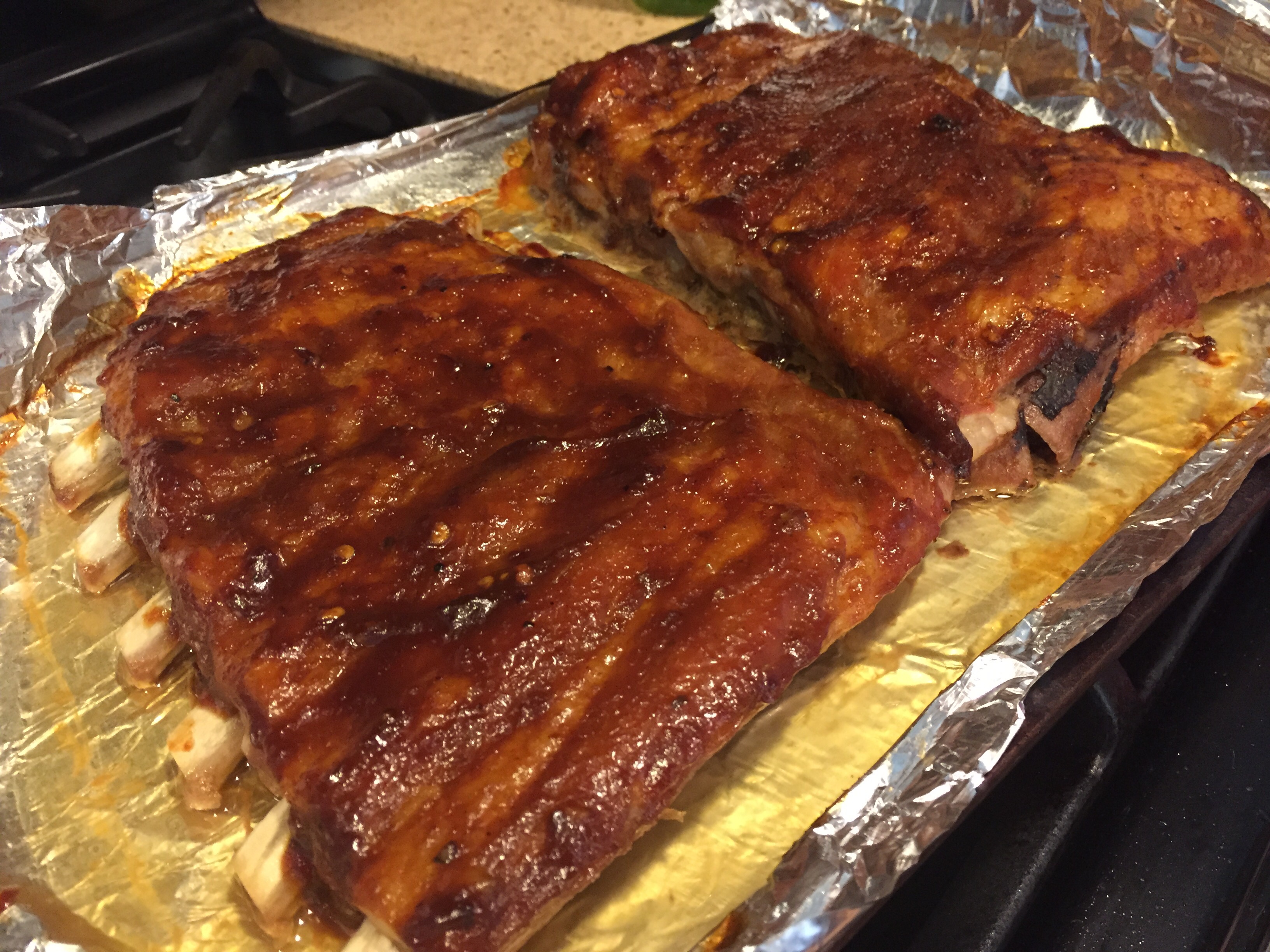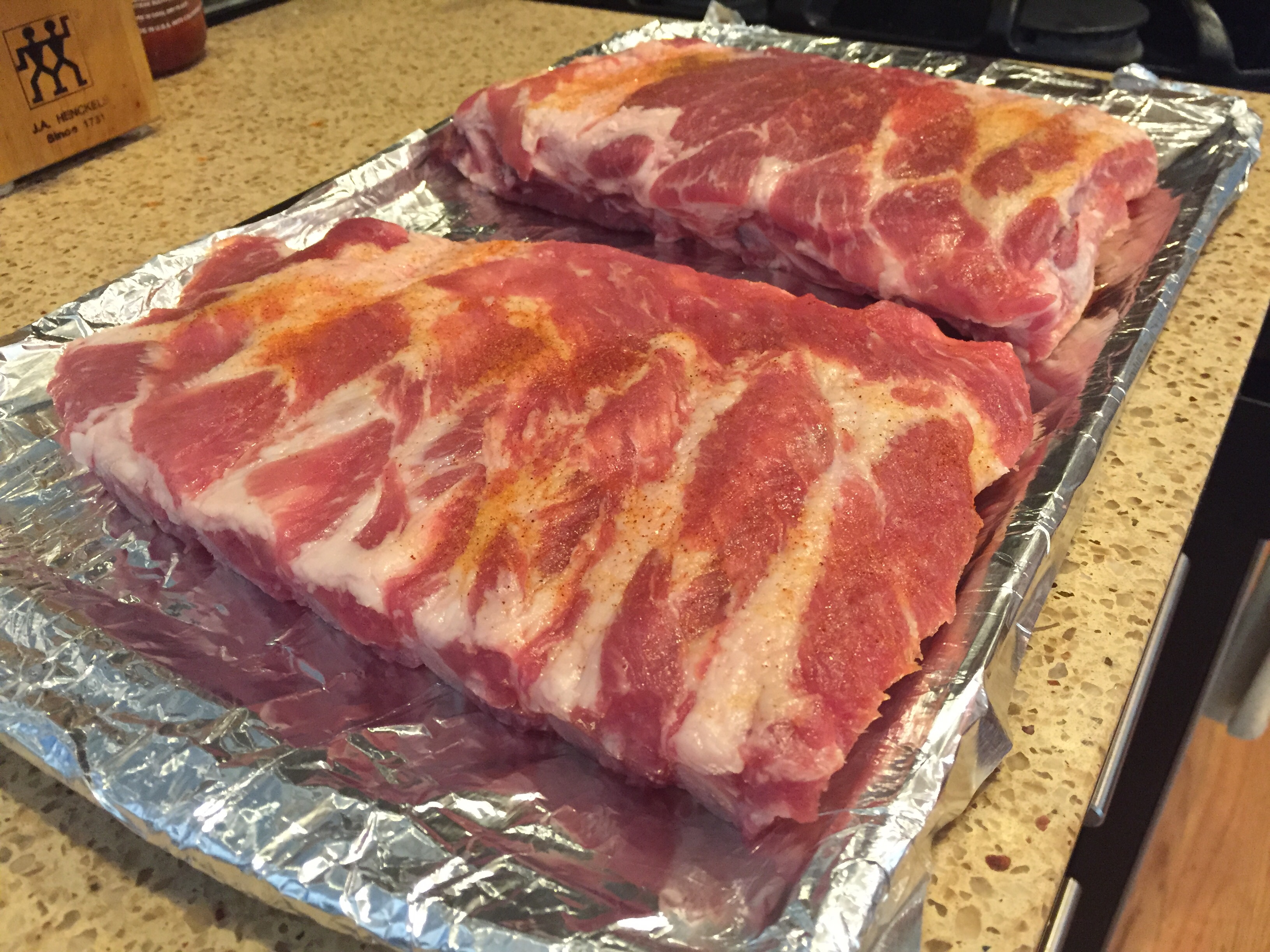 Preheat your oven to 325 degrees. If there’s still some remaining film on the back of your ribs, trim it off and pat them dry, then sprinkle Lawry’s seasoning salt on both sides. Line a baking sheet or roasting pan with foil and place your ribs on to the pan. Take more foil and cover the ribs, folding the ends of the foil together to seal the ribs. Place them in your oven for about 2 hours.
