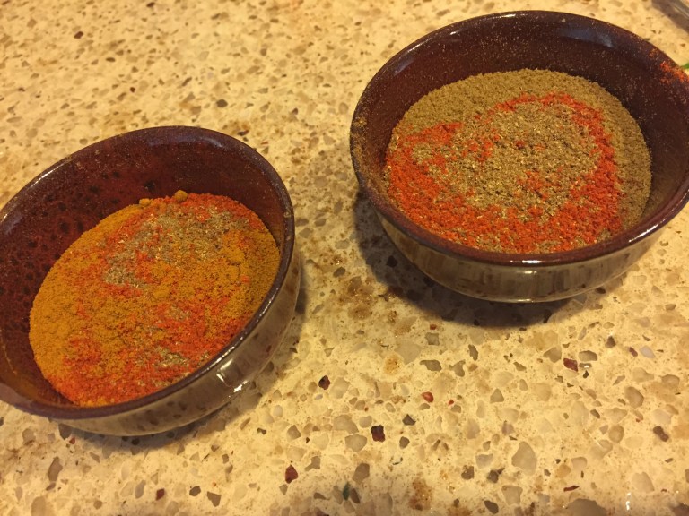 Next, get your spice mixes ready. The spices go in at the same time so again, you can throw it all into one dish. Make sure you remember which is which!