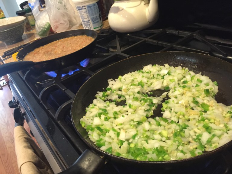 Multitask! Or if you don’t feel comfortable, start the saag first since it takes longer to cook. Indian food is all about making sure those layers of flavor are there, so you’ll cook the tomato mixture for the chana masala first, while you cook the garlic/ginger/onion/jalapeno over medium heat for the saag.