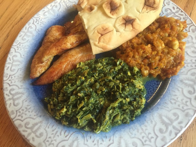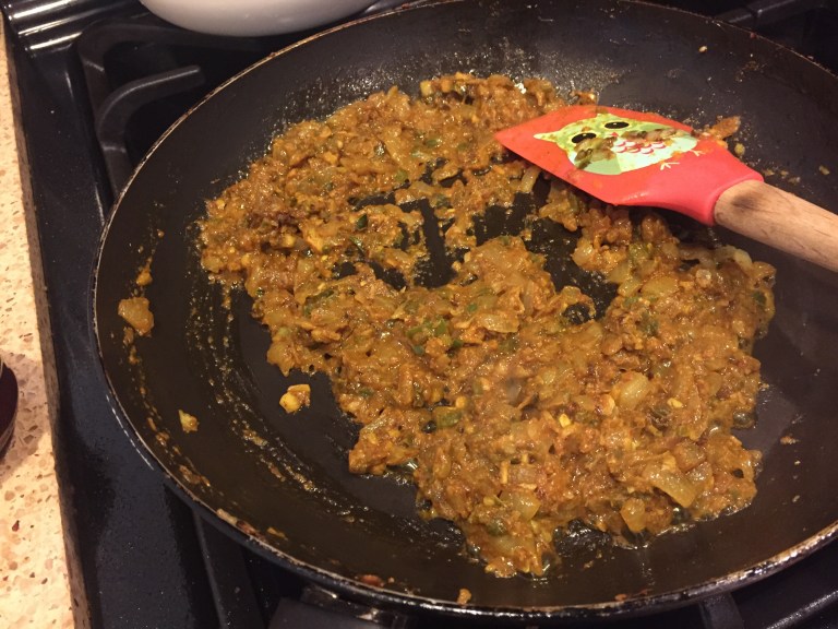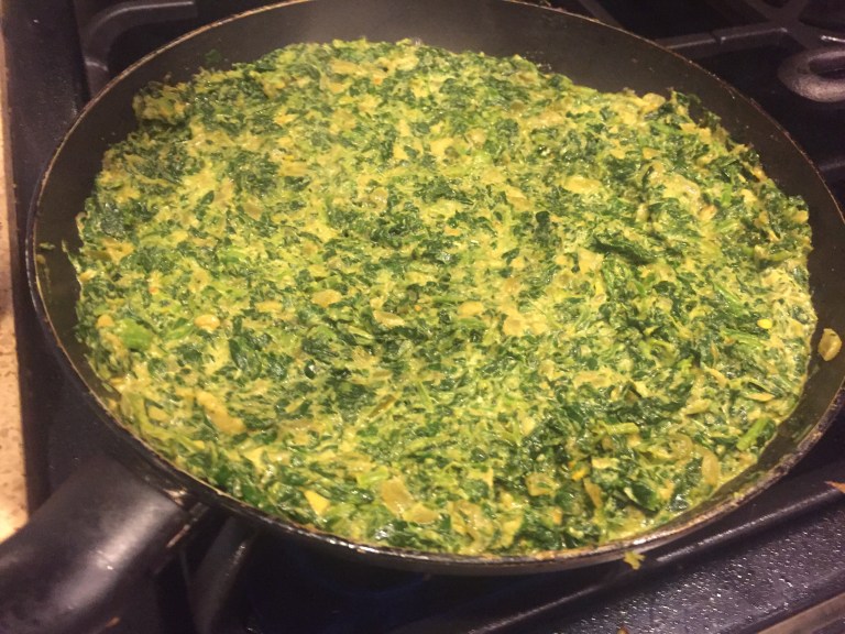 The saag takes a bit longer. Cook the mixture over medium/low heat until it all turns a uniform golden brown, then add your spices. Add some water to keep the spices from burning, and cook this some more over medium heat until the spices start to blend together.