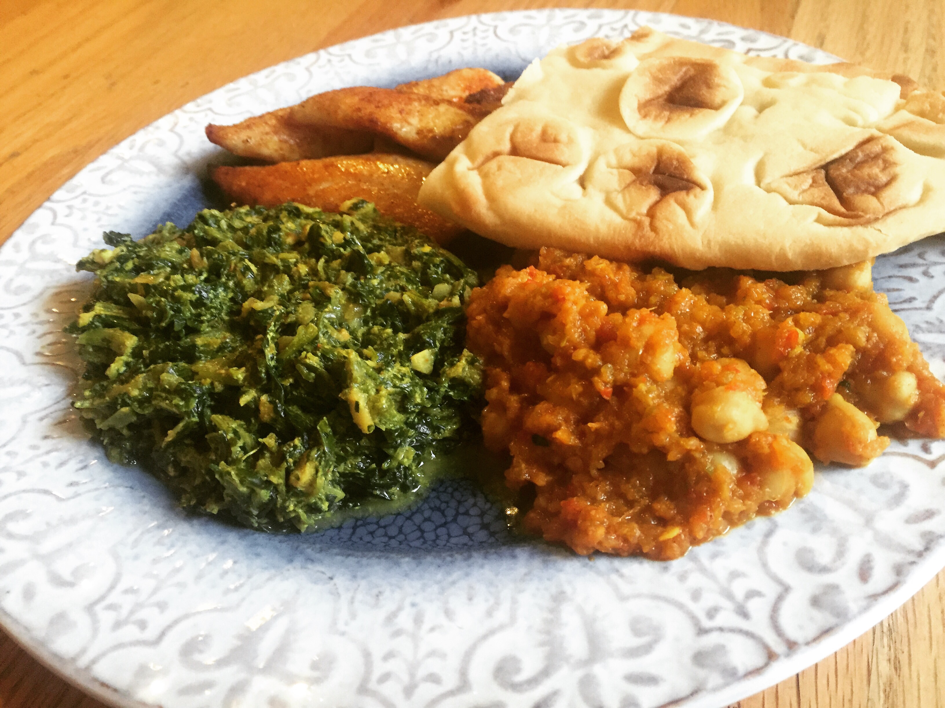 Saag is one of my favorite sides – a simmered spinach dish. I got this recipe from Aarti Sequeria, and the chana masala recipe can be found here. I’m not going to list all the ingredients below because there are 1000000, but I will walk you through the process!