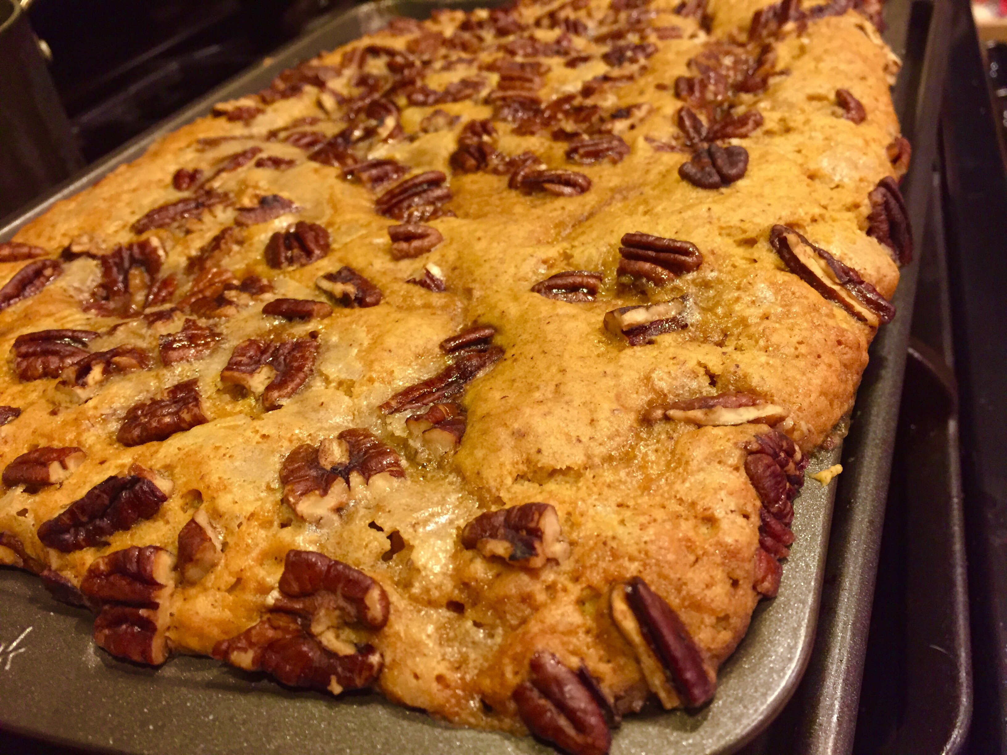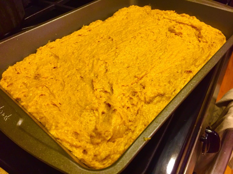 Pour the wet ingredients into the bowl with your dry mixture and it should form a thick batter. Pour the batter into a prepared pan – an 8×8 dish should do fine for this recipe. If you double it like I did, use a 13×9 dish.