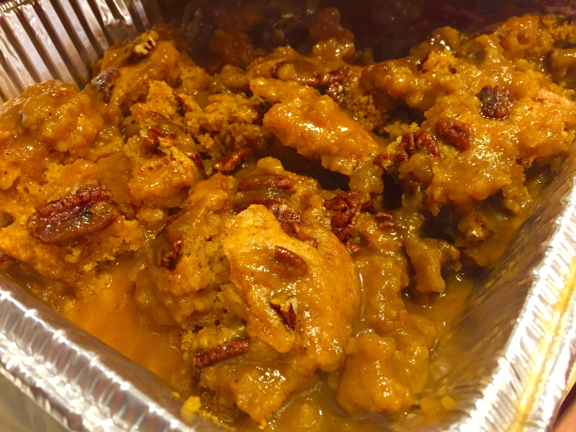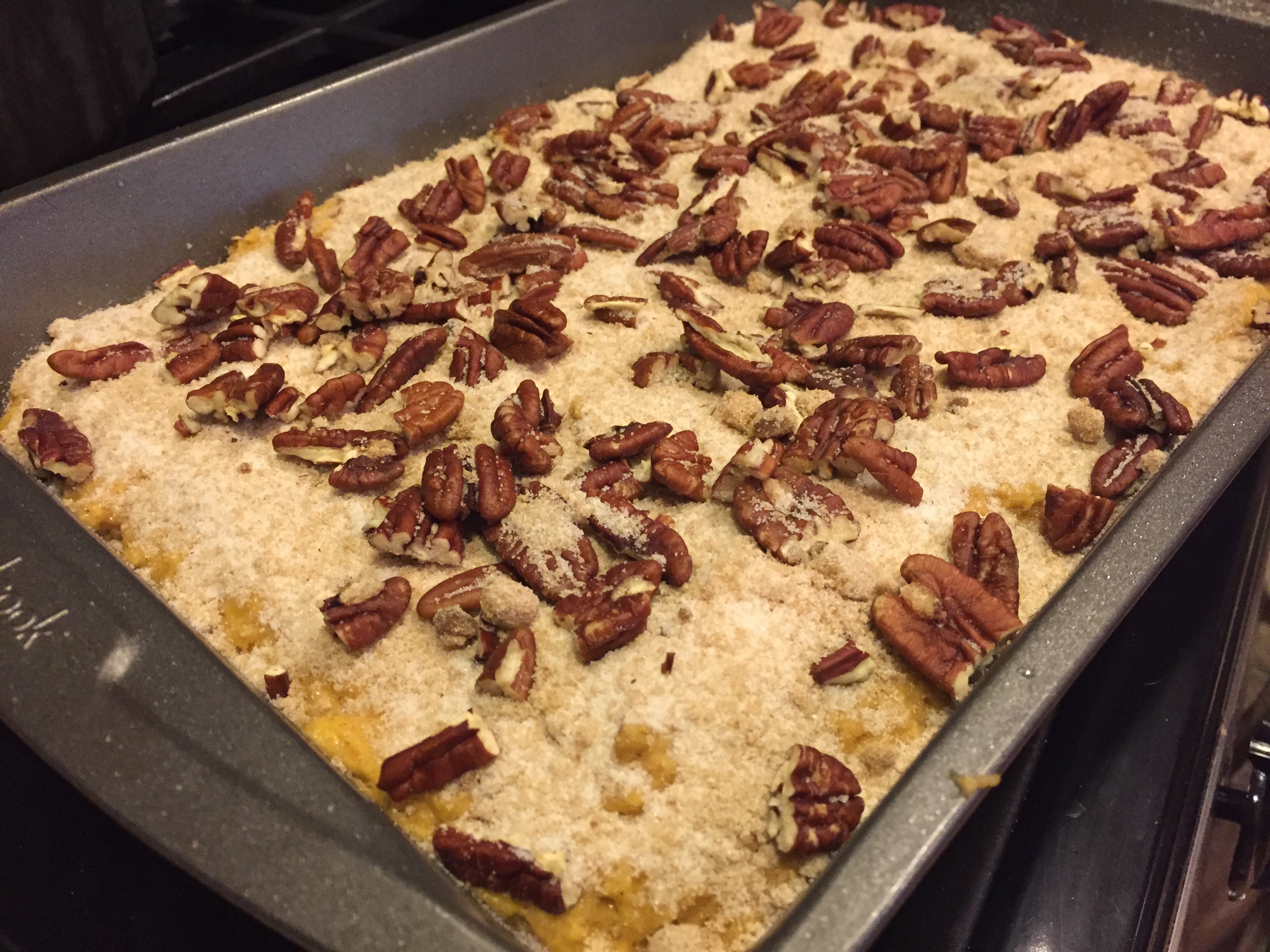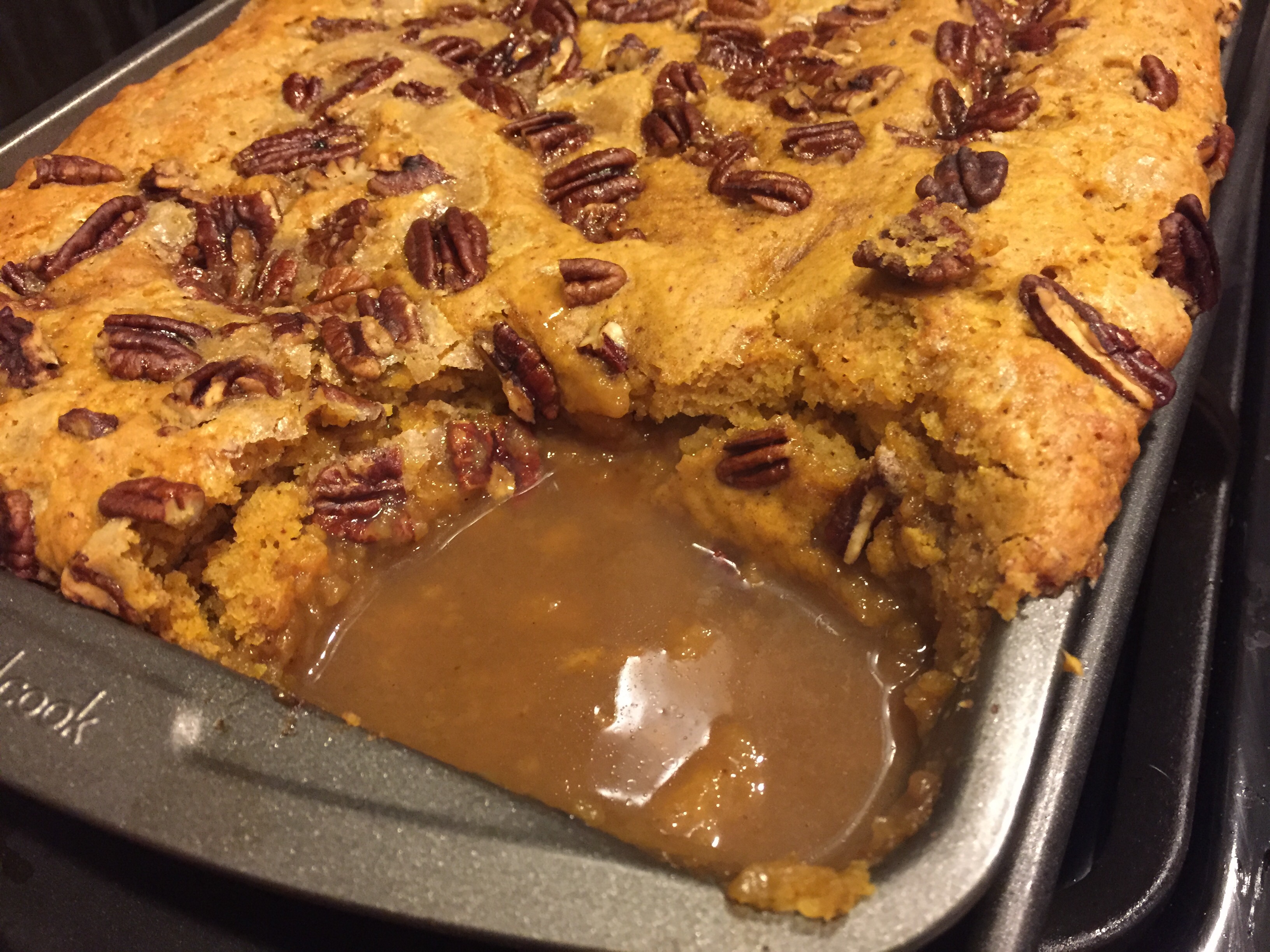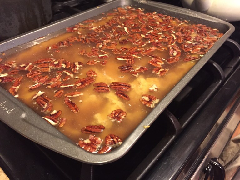 Combine the sugar, brown sugar, and pecans and sprinkle all over the batter. Get some suuuuuper hot water and pour this all over the top. I know, this makes zero sense but ~*science*~.