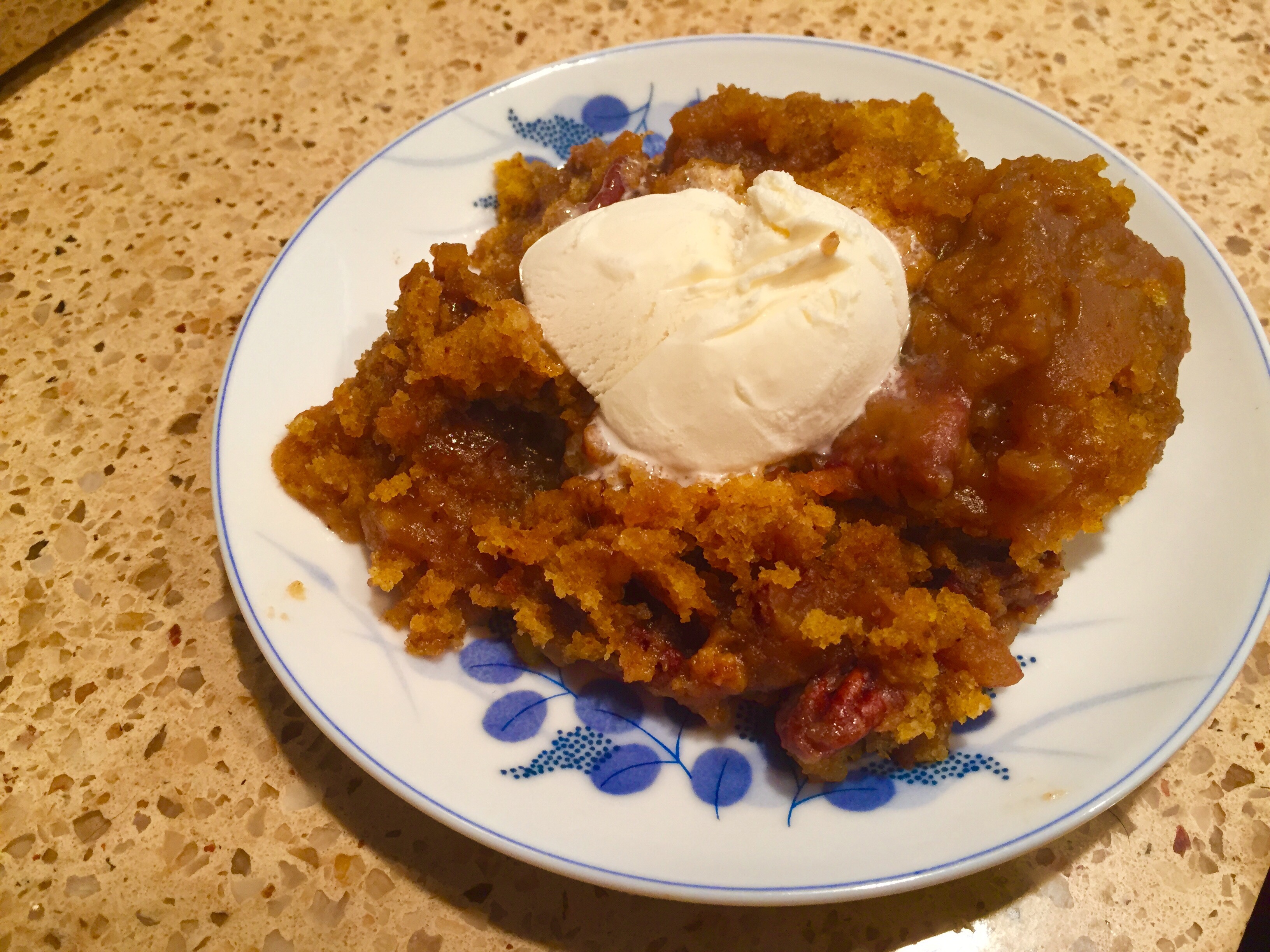 Divide into portions and spoon the sauce from the bottom of the pan onto the cake. Top with ice cream and enjoy!