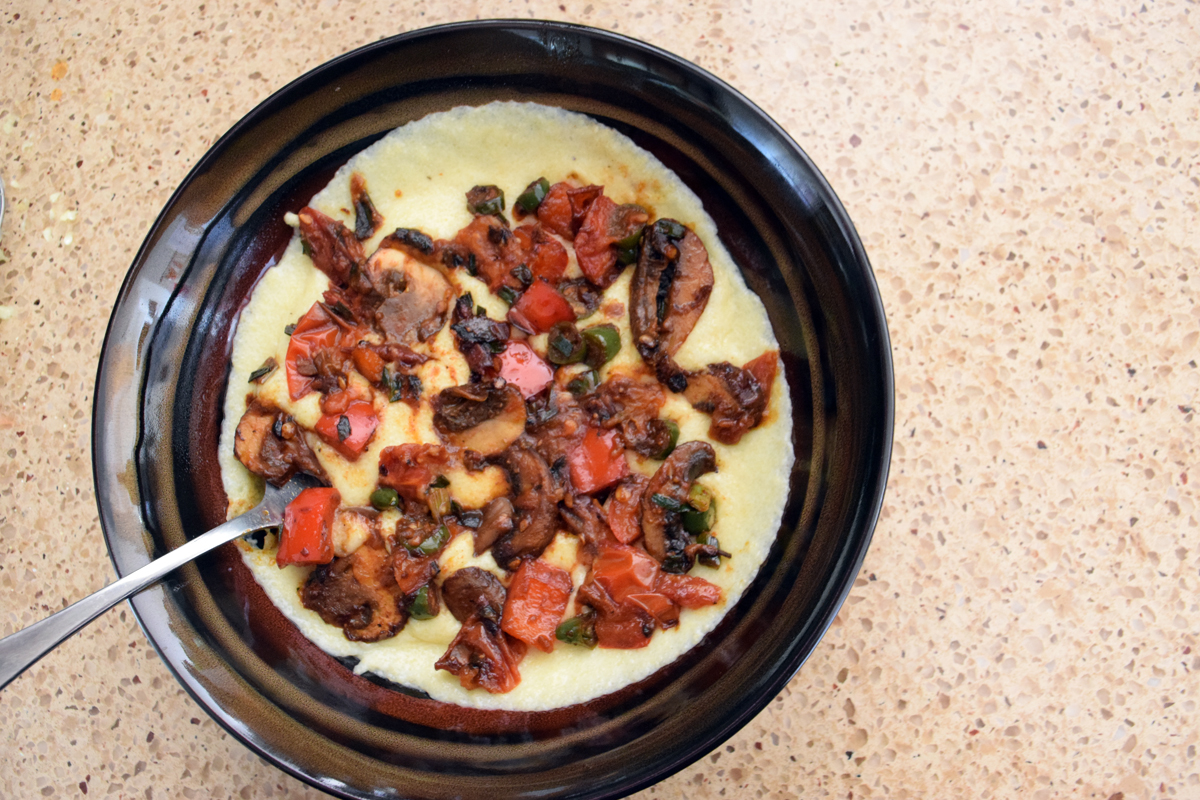 Polenta is super creamy when you cook it low and slow, and with a dash of cream it’s a comforting dish. Sauteed veggies go on top, and if you’re feeling extra ambitious you can add a poached egg.